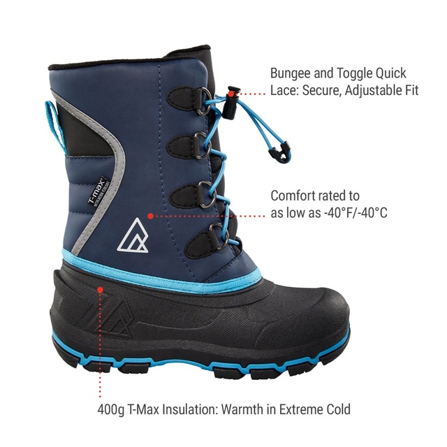 The Ripzone Kids' Whiteout Easy-On Winter Boots are designed to keep little feet warm and protected. With exceptional insulation, they are perfect for cold-weather adventures. The waterproof upper and durable overlays keep moisture out, while the fleece lining adds coziness. These insulated boots instantly make you winter-ready; their reflective details improve visibility for a hassle-free experience.