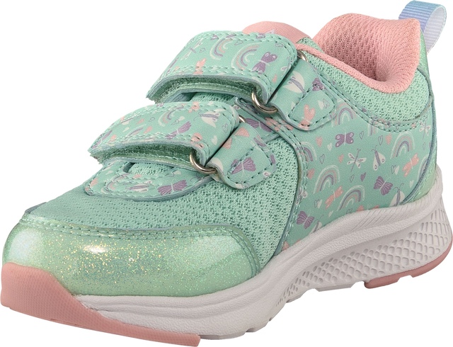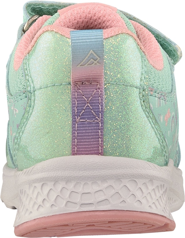 Printed PU, TPU glitter, and mesh upper for breathability and style