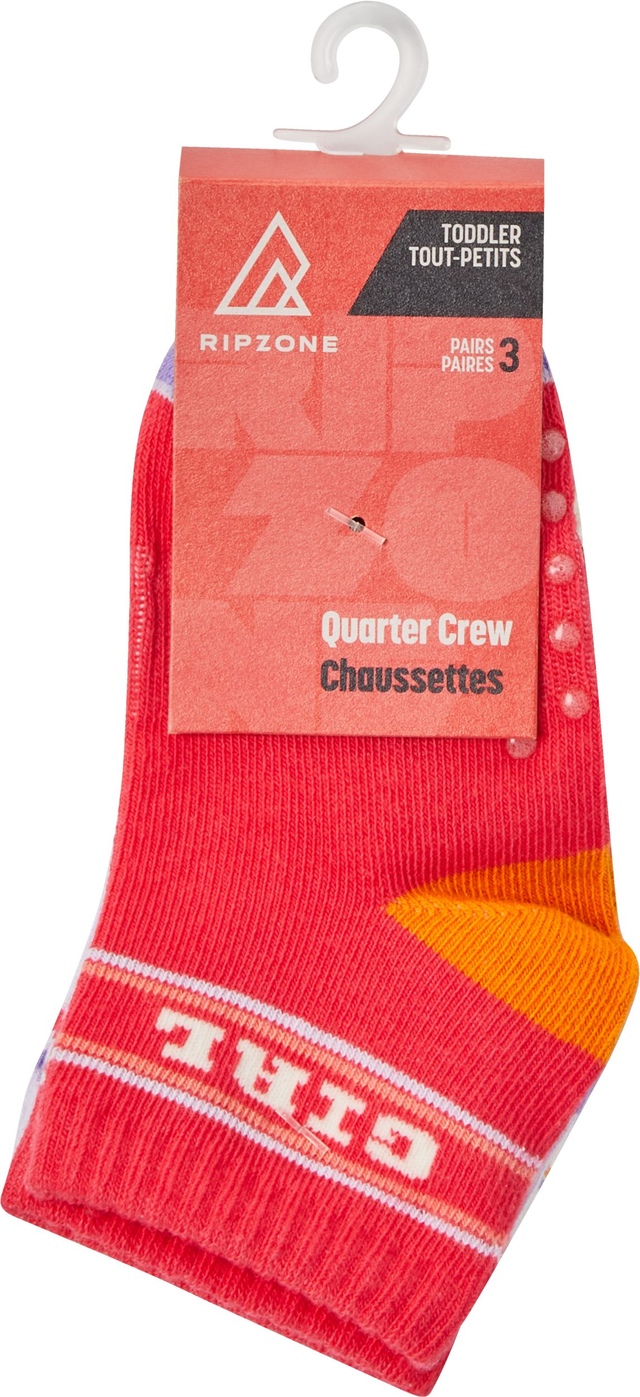 The Ripzone Toddler Girls’ Varsity 3-Pack Quarter Crew Socks offer a range of graphics they can reach for to bring fun to their feet. Made with a cotton blend knit and designed with ribbed arches for all-day comfort. Finished with gel on the sole for the added traction to keep up with littles on the go.