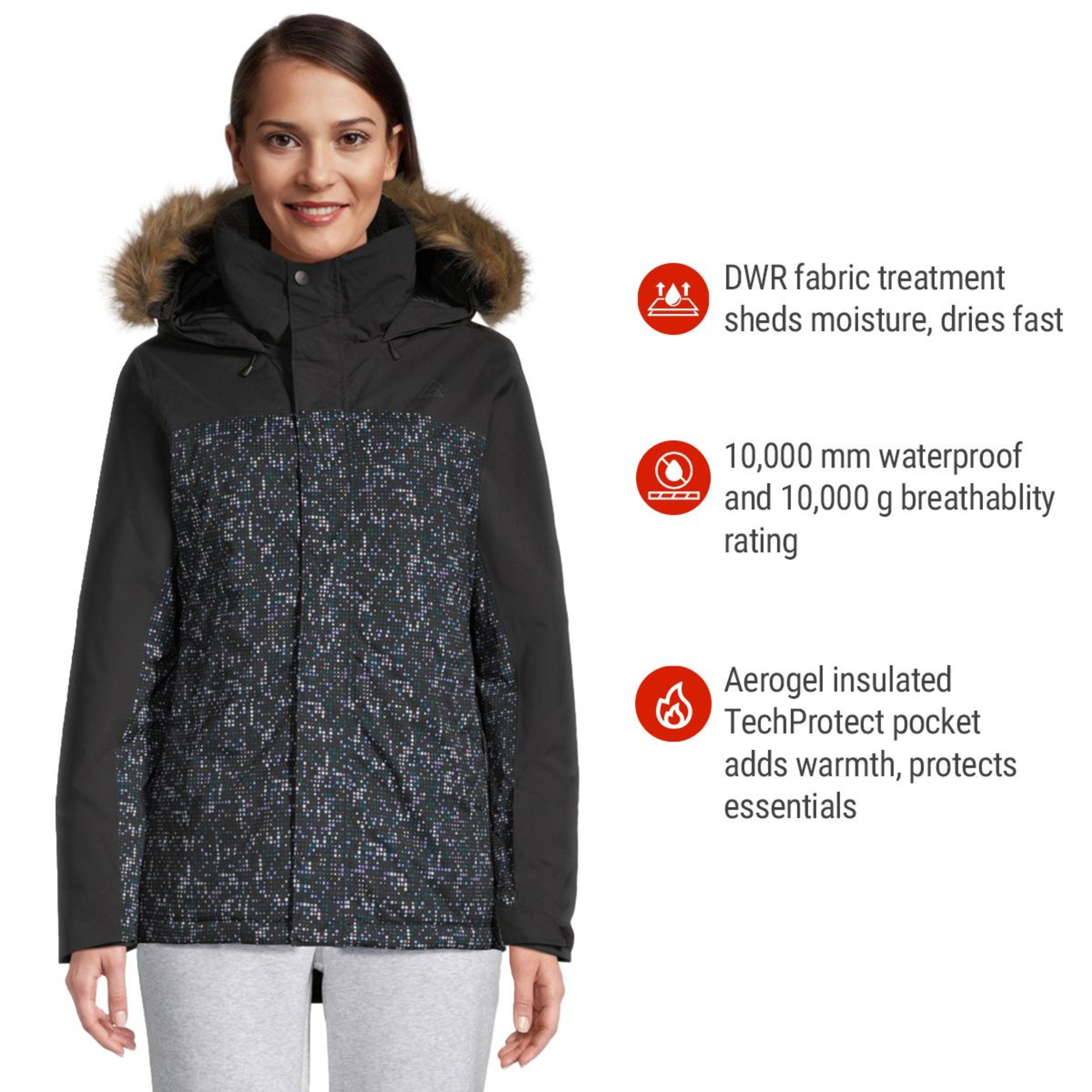 | Advanced Features | Fully Seam Taped,PFC – Free Water Repellency,Faux Fur Trim,Waterproof,Recycled Content |
