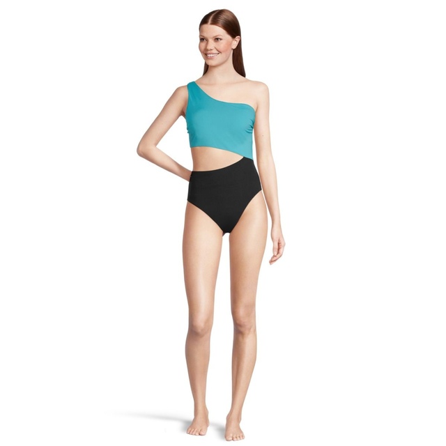 One-shoulder cutout with an asymmetric neckline lends a contemporary look