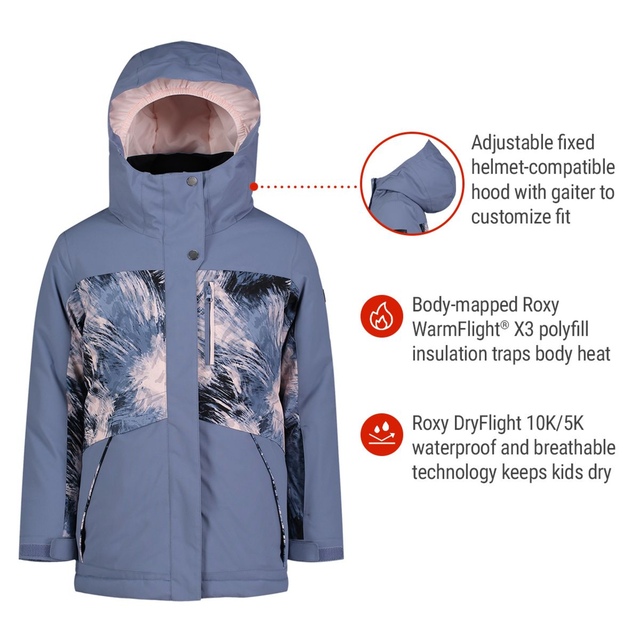 The Roxy Girls' Dawnrae Parka Jacket is a winter-ready waterproof and breathable girls winter coat designed for cold-weather activities like snowboarding and skiing.