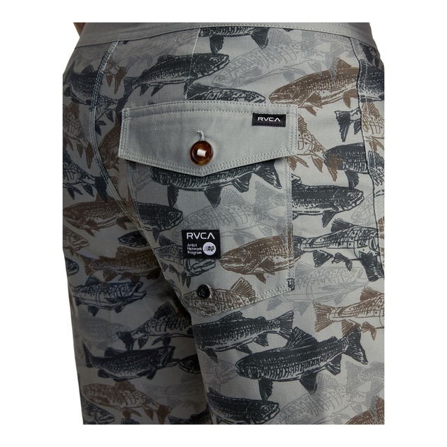 Blend into the water in the RVCA Ben Horton Fish Camo Boardshorts 18”. Made from recycled polyester blended 4-way stretch fabric, these men’s fixed-waist boardshorts feature a custom allover print by ANP artist Ben Horton. Built with a zip fly closure, adjustable drawcord and back patch pocket for all your needs.
