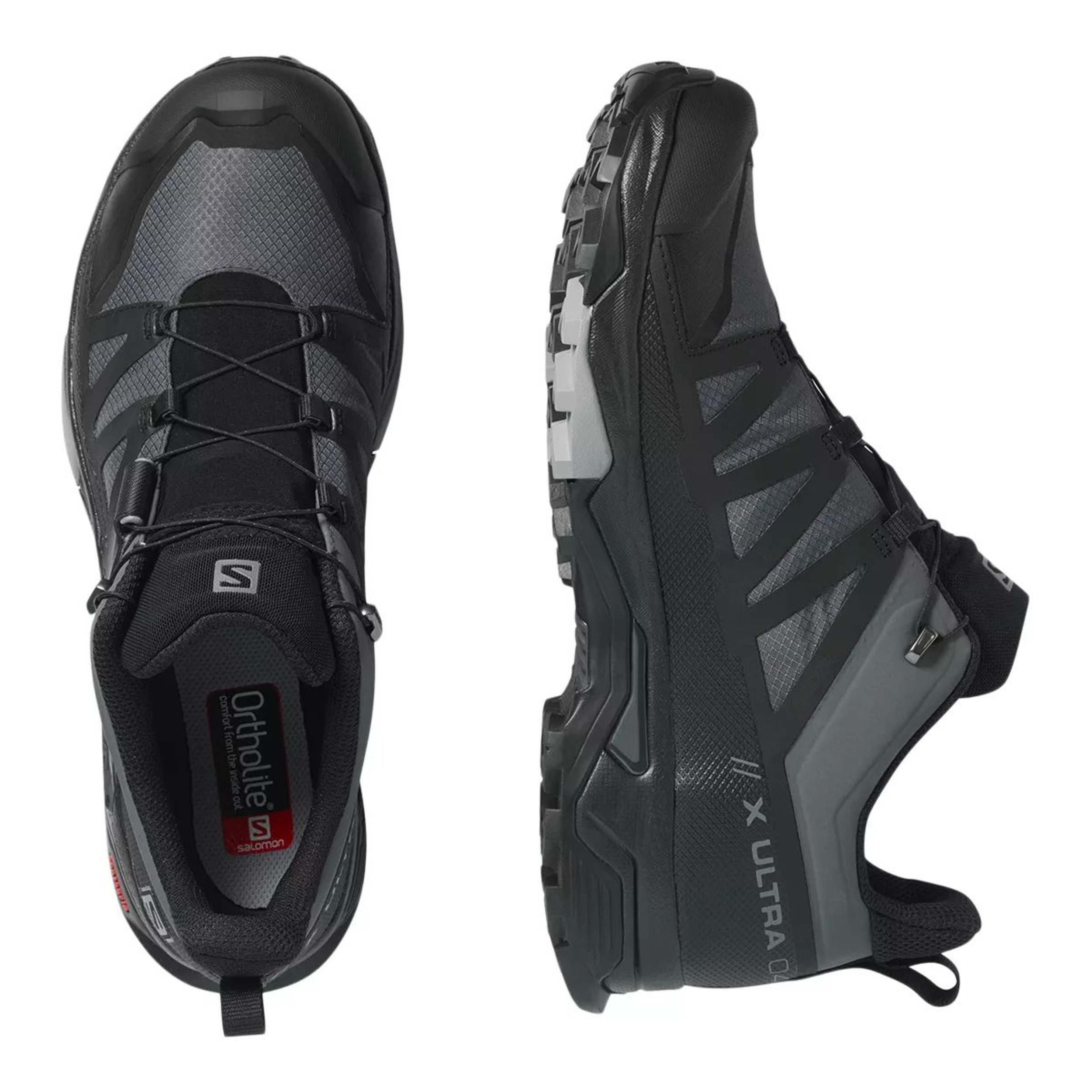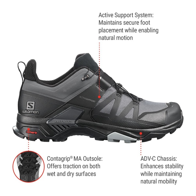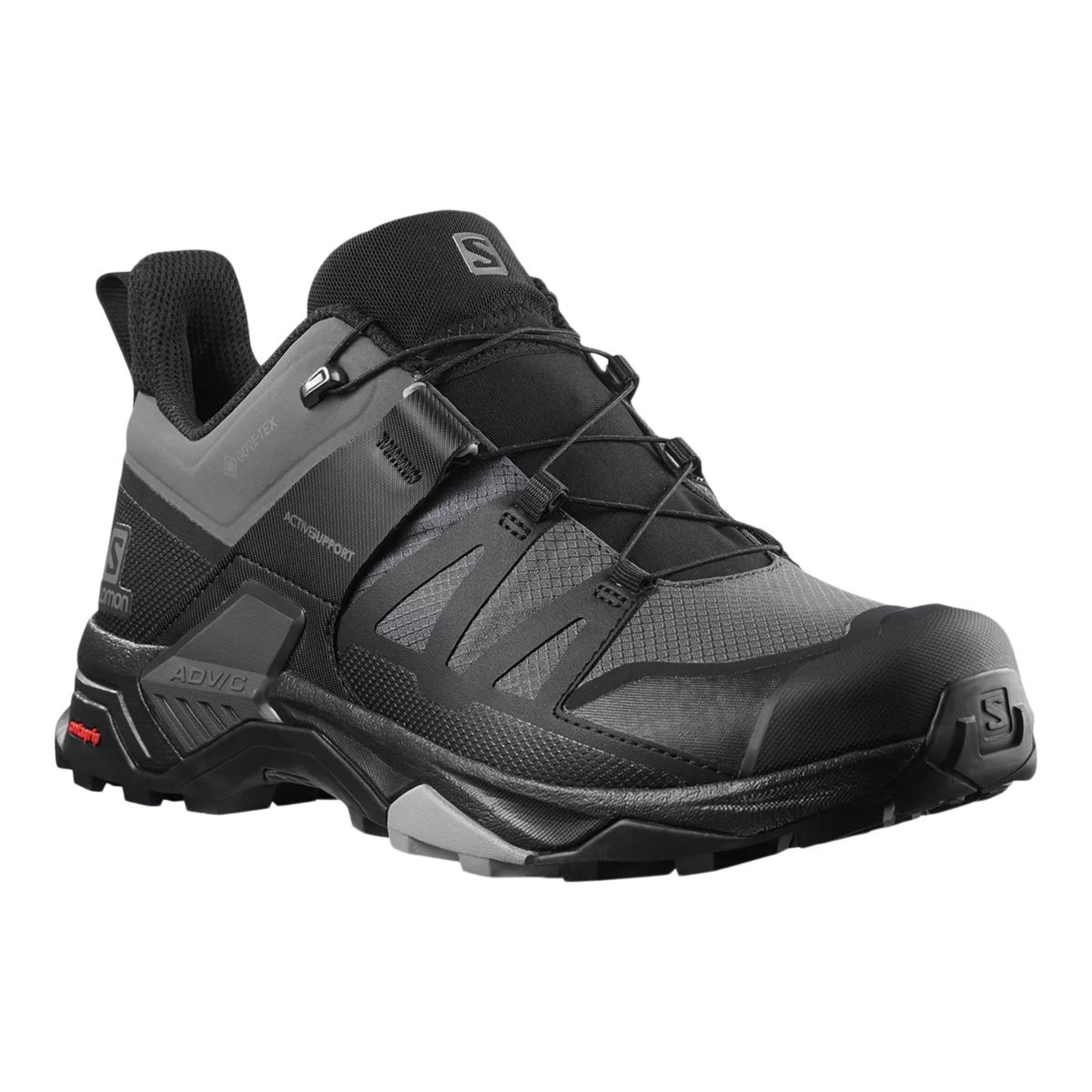Explore the trails with confidence in the Salomon Men's Ultra 4 Hiking Shoes. Designed for agility and stability, they feature an ADV-C Chassis for mobility and Contagrip® MA for all-terrain grip. Active Support adapts to your foot's movement, ensuring durability and control on varied surfaces. GORE-TEX waterproofing keeps your feet dry, making these Salomon men's hiking shoes an ideal choice for any adventure.