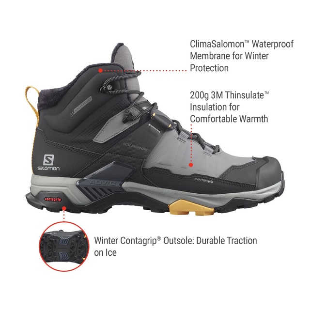 These Salomon Men's Ultra 4 Mid Winter Boots are built for cold-weather performance. ClimaSalomon™ Waterproof technology keeps your feet dry and 3M Thinsulate™ 200g insulation keeps them warm. These Salomon winter boots provide the stability and comfort you need when walking in harsh environments.