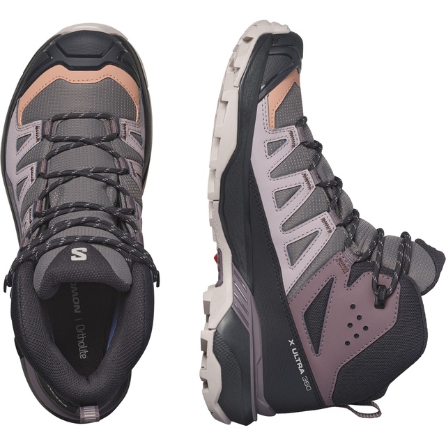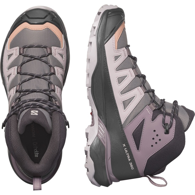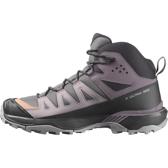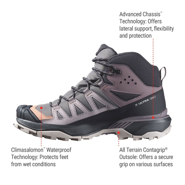 For outdoor exploration, these Salomon Women's X Ultra 360 Hiking Shoes are packed with useful technologies. All-Terrain Contagrip holds onto variable surfaces and an Advanced Chassis™ enhances stability. These shoes are ideal for tackling any terrain and weather conditions.