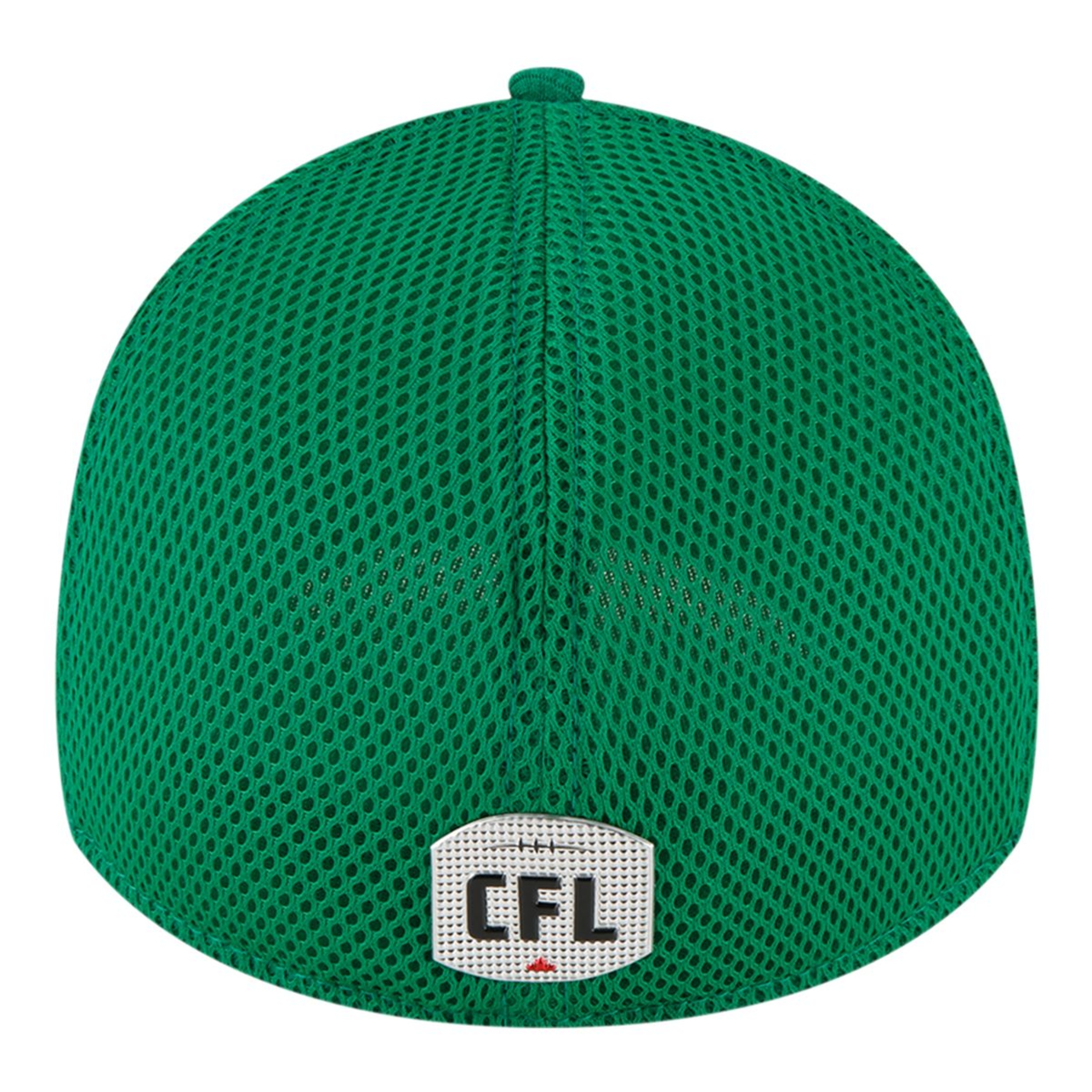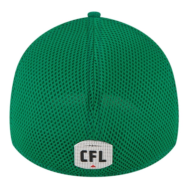 Saskatchewan Roughriders Sideline 39THIRTY stretch fit cap. Team colour pivot mesh fabrication throughout. Riders primary logo patch on front. CFL logo in liquid chrome badge at the back.