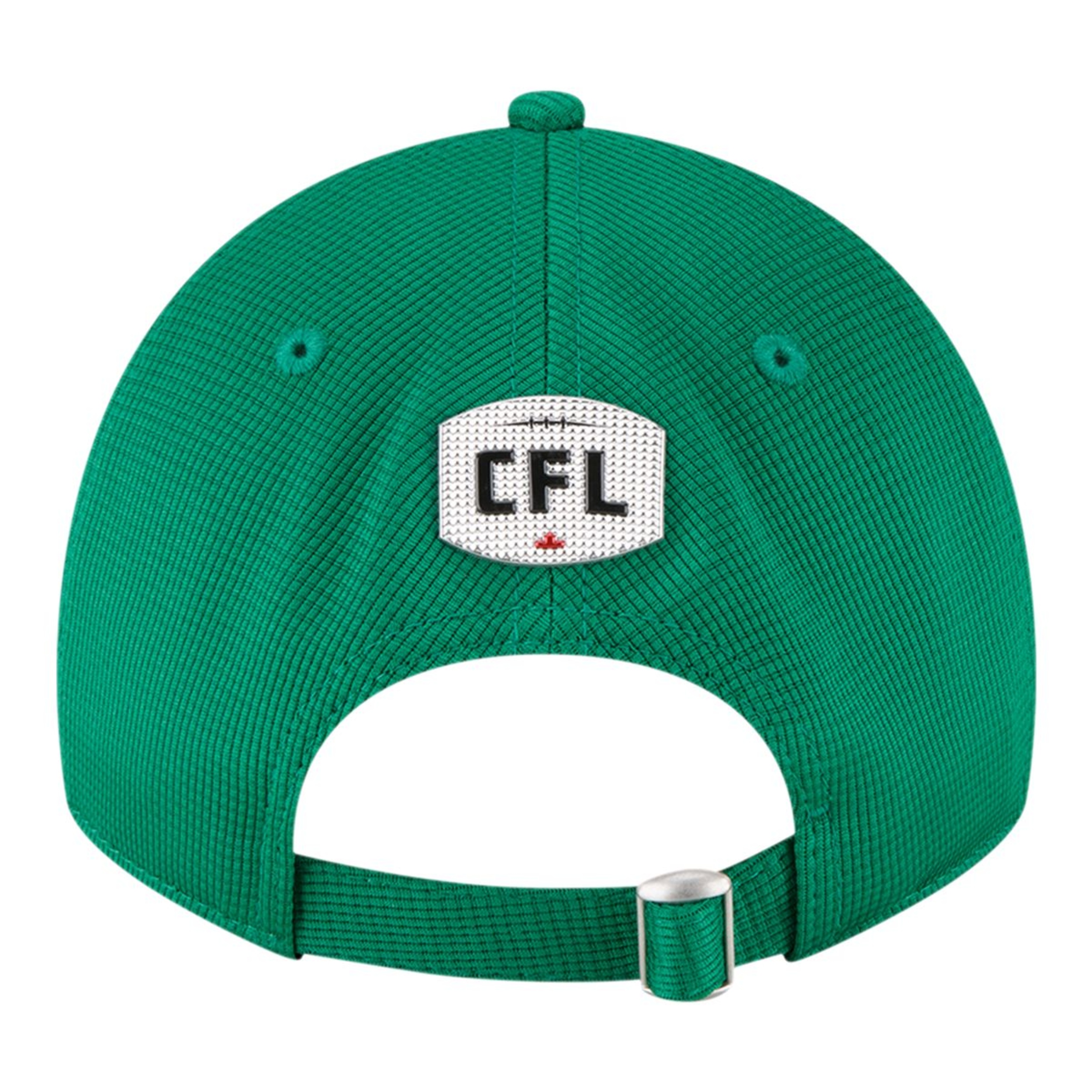 Saskatchewan Roughriders Sideline cap. This 9TWENTY lightly structured adjustable cap has team color pivot mesh fabrication throughout. Riders logo, a high density silicone rubber patch with embroidery, on the front panels. A metallic chrome CFL badge adorns the back of cap above fabric strap closure.