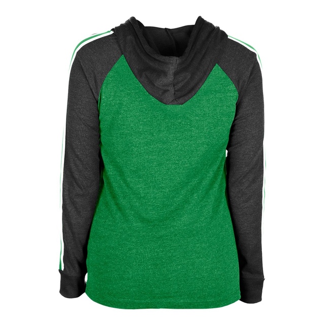Saskatchewan Roughriders New Era Women's Low Hoodie features feathered team colour body with contrast colour raglan sleeves and hood. Riders script team wordmark and logo design in high quality print on front chest. Team striping down the arms to represent the Saskatchewan Roughriders.