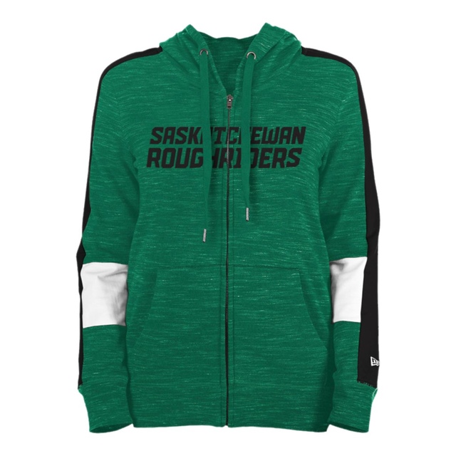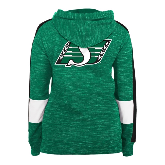 Saskatchewan Roughriders women's CFL full-zip hooded sweatshirt. Team Color space-dye fabrication with secondary team color striping down the outside of sleeves. Riders wordmark screened across the front chest, and large team primary logo screenprinted on the back.
