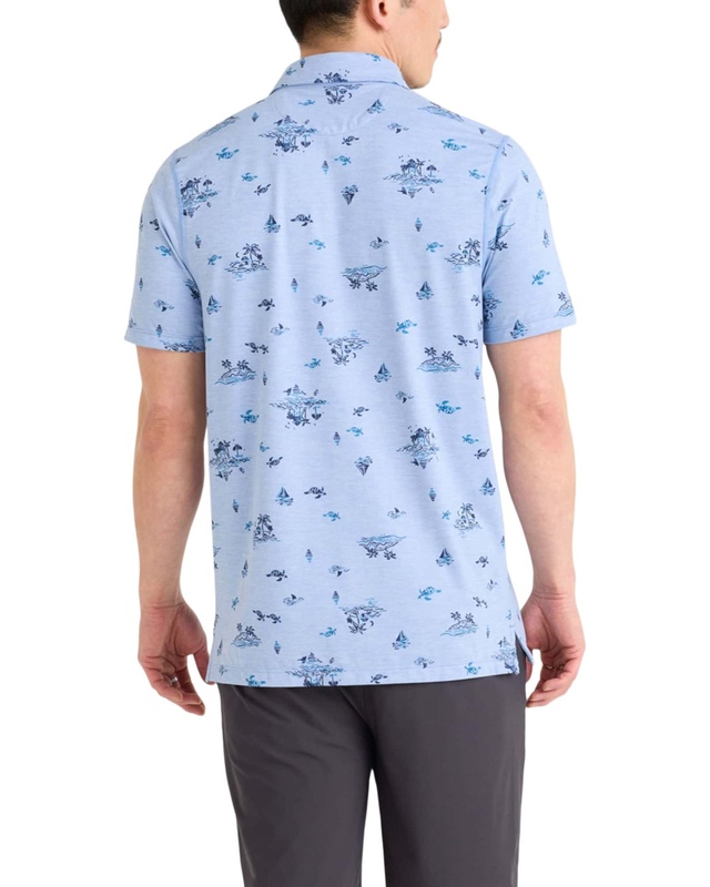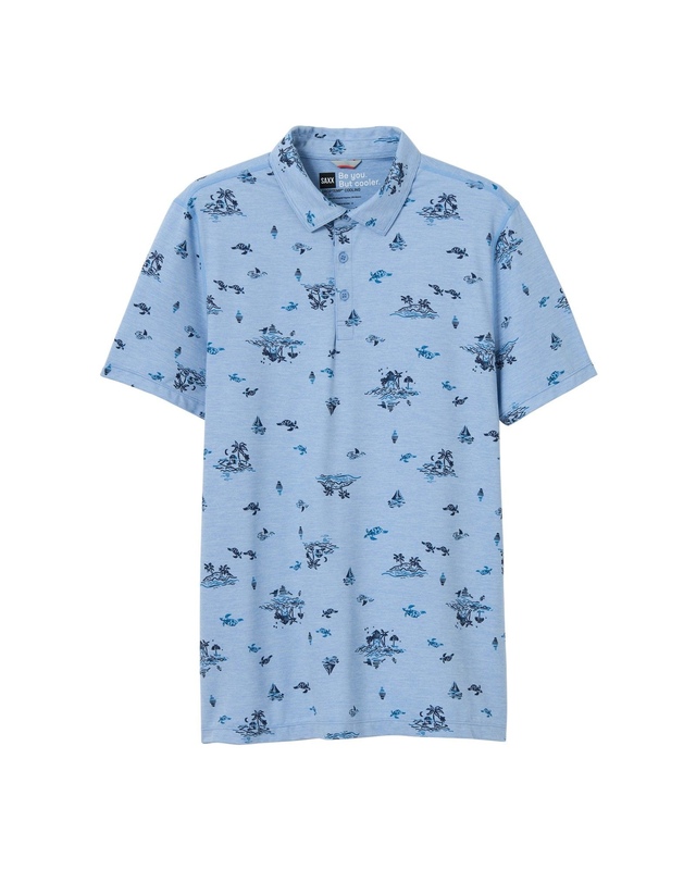 The SAXX Men's DropTemp® Print Polo T Shirt features DropTemp™ evaporative cooling technology that actively cools and wicks moisture, keeping you dry and comfortable.