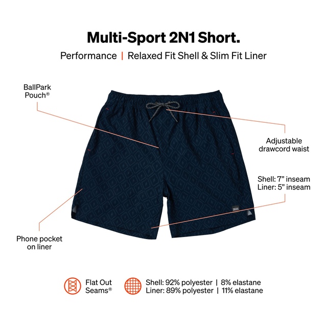 The SAXX Men's Multi-Sport 2 in 1 7 Inch Shorts offer core comfort with their four-way stretch, moisture-wicking fabric that dries quickly. Their functional features and stylish design provide unparalleled support and breathability.