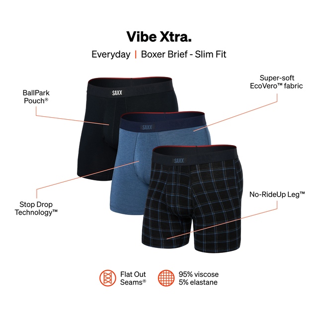 Boxers should simply keep you comfortable throughout your day, and that's why SAXX designed the Vibe Xtra with Stop Drop Technology™. They've taken the fan-fave Vibe Super Soft, and enhanced it with functional features. Made with super-soft and naturally breathable materials, Vibe Xtra features a wicking fabric structure that's integrated into the pouch to provide an all-day dry and comfortable sensation. Features a fly and 6" no ride up leg.