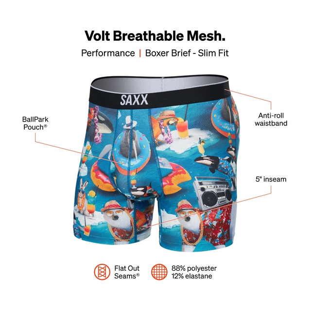 Stay cool and comfortable with the SAXX Volt Men's Boxer Briefs. These slim-fit briefs feature breathable pin-dot mesh and the patented BallPark Pouch™ for optimal support without friction. Moisture-wicking and odour-resistant, they're ideal for active use. Stylish photo-realistic prints complete the design, ensuring both performance and personality.