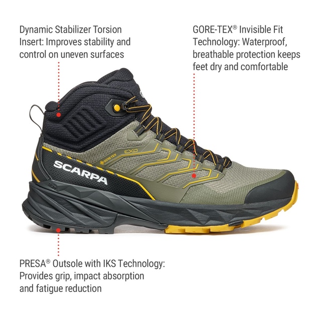 The Scarpa Men’s Rush 2 Hiking Shoes offer an ideal blend of agility and support for outdoor enthusiasts. The mid-high mesh and synthetic upper features GORE-TEX® for guaranteed waterproof protection, while the Presa® outsole provides exceptional stability and traction on any terrain. Combining the comfort of a running shoe with the support of a boot, these hikers are designed to enhance your performance.
