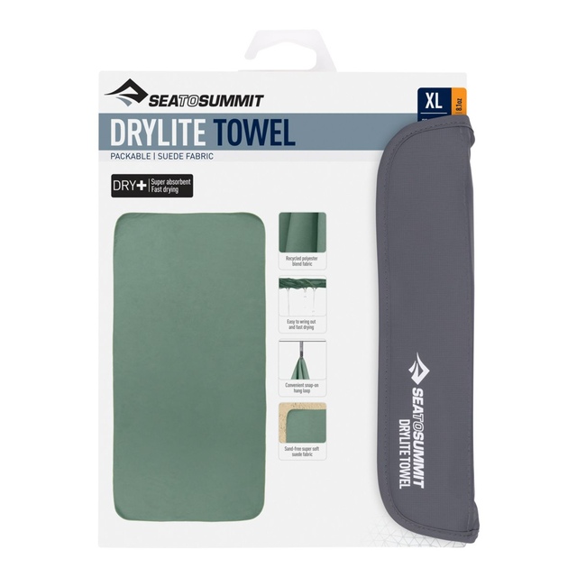 The Sea To Summit Drylite Extra Large Towel is made from 80% recycled polyester and 20% nylon, offering outstanding absorbency and quick drying properties. This packable, machine-washable microfiber towel features a super soft, ultra-suede finish. The Sea to Summit towel includes a mesh-faced storage pouch and a convenient hang loop for easy portability and hanging.