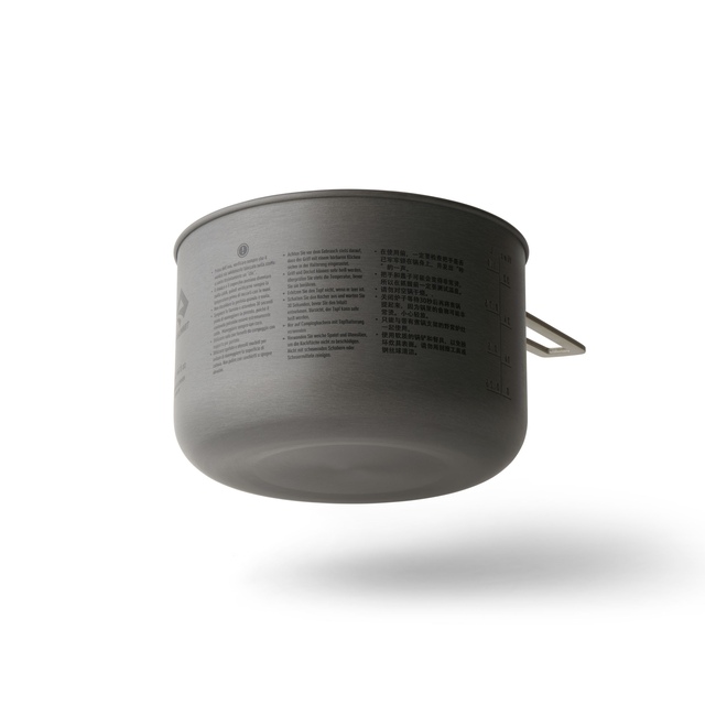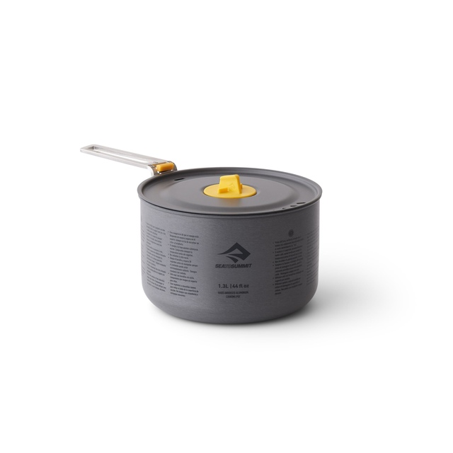 The Sea to Summit Frontier 1.3L Pot is made of hard-anodized aluminum for durability and efficient heat transfer. It features a ceramic non-stick coating and strainer holes in the lid. A Click Safe Handle in this cooking pot offers a secure grip and locks the lid and nesting contents during transport.