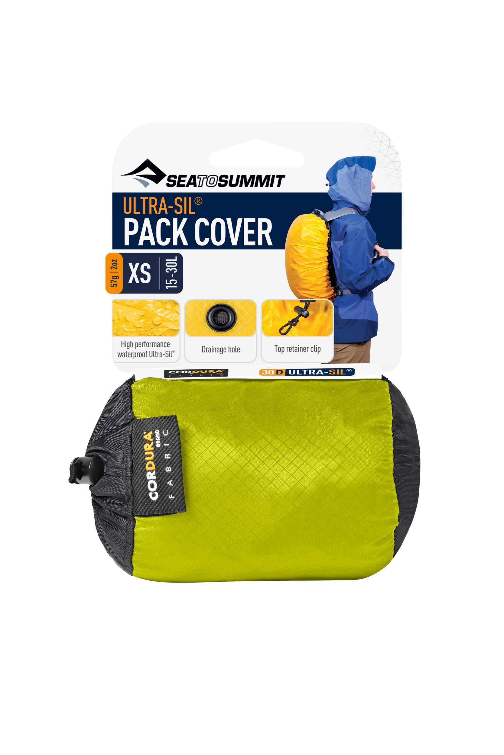 The Sea to Summit Ultra-Sil 15/30L Extra Small Pack Cover provides a packable solution for keeping your backpack contents dry in wet conditions. Made from waterproof Ultra-Sil siliconized CORDURA® fabric with a seam-free design, this cover protects you against rain and moisture while remaining compact. A drainage hole at the base of this waterproof cover prevents water pooling, and the attached Ultra-Sil stuff sack ensures you won't misplace the cover on the trail.