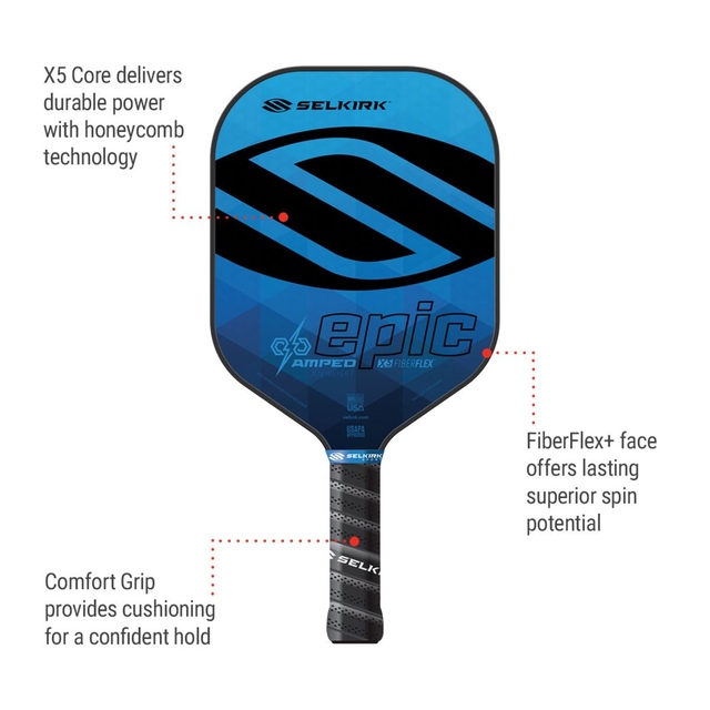 The Selkirk AMPED Epic Midweight Pickleball Paddle is the ultimate all-around pickleball paddle suitable for players of all levels. It features a long handle with a large surface area for exceptional power, control, and precision. The longer handle is great for two-handed swings, while the perfectly proportioned hitting area with the increased sweetspot enhances precise shots during play. This lightweight design on this paddle allows for quick maneuverability and control on the court.