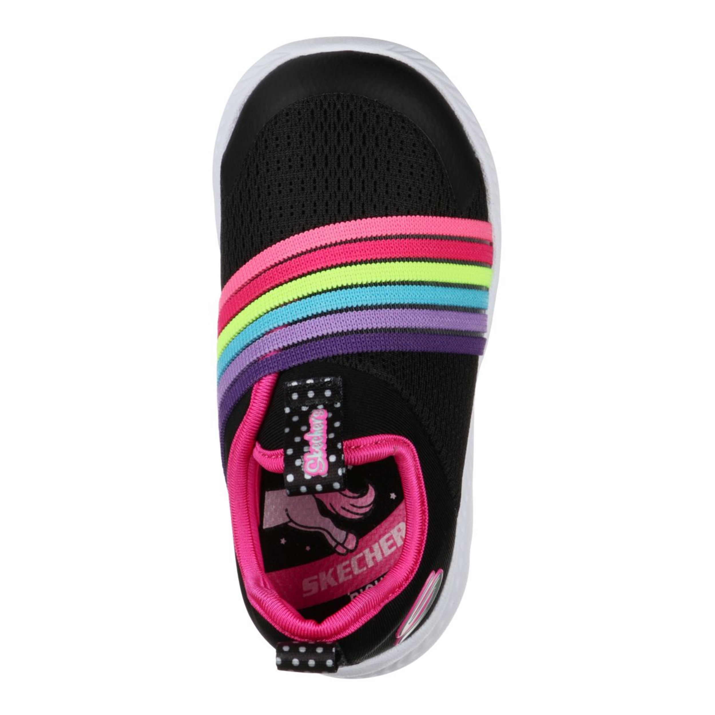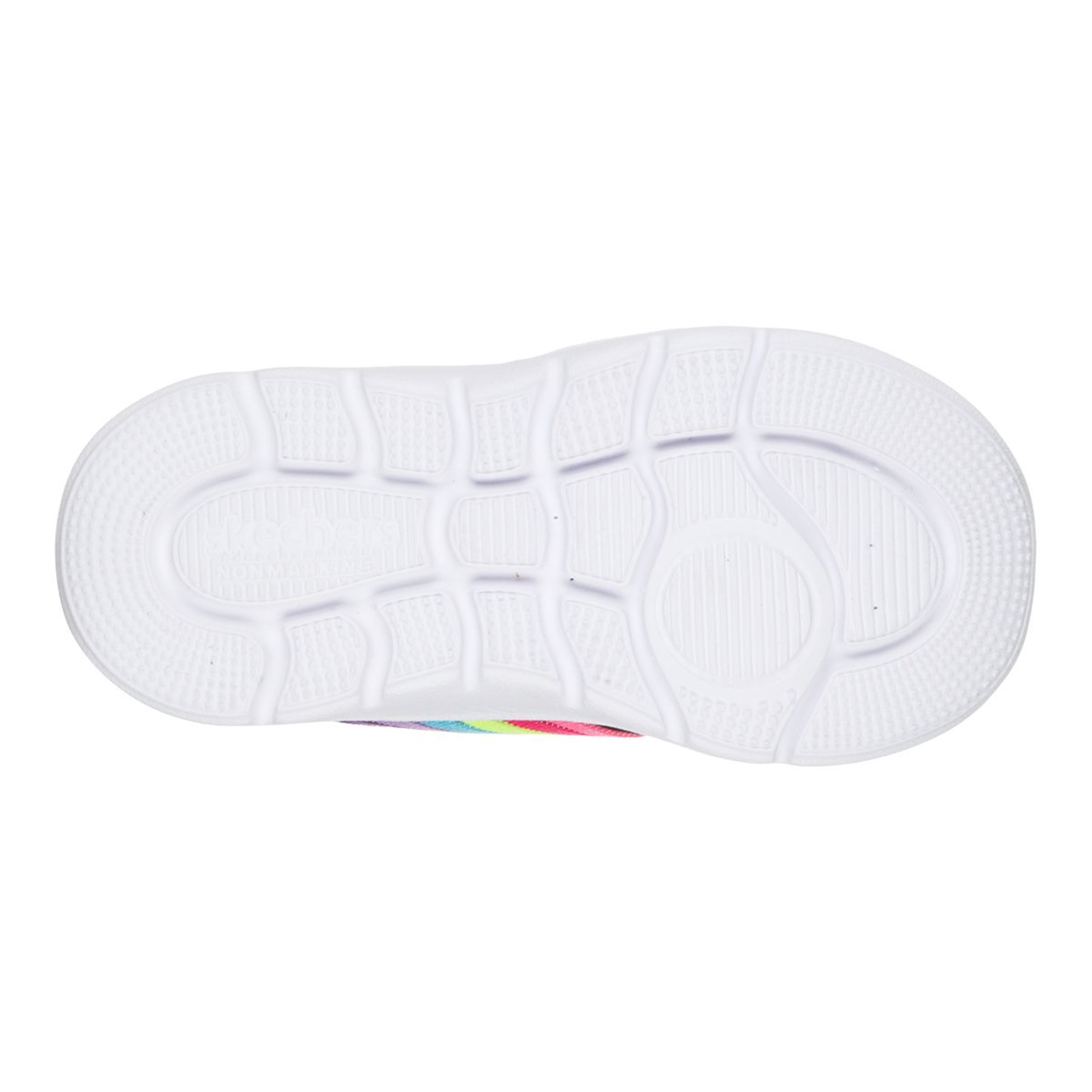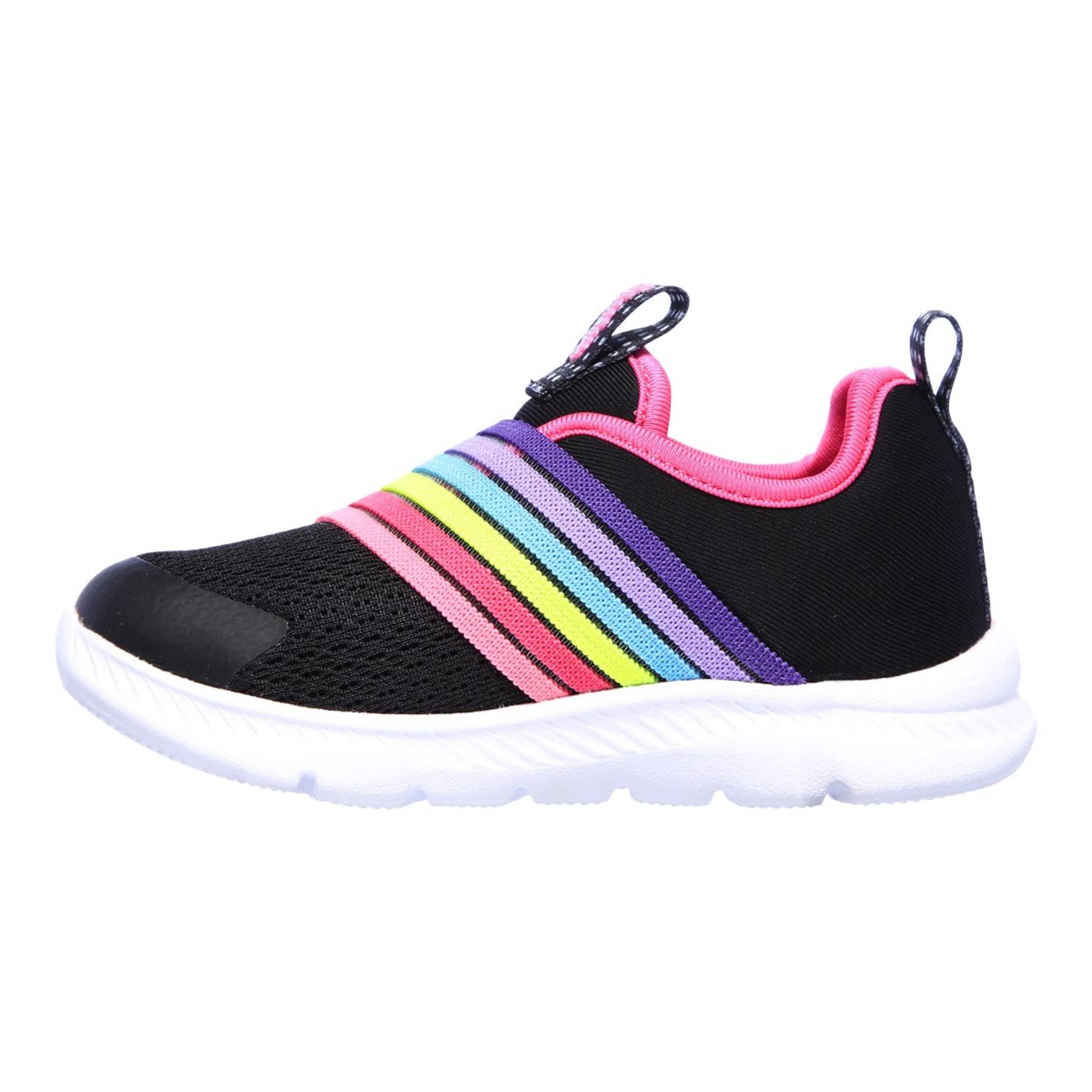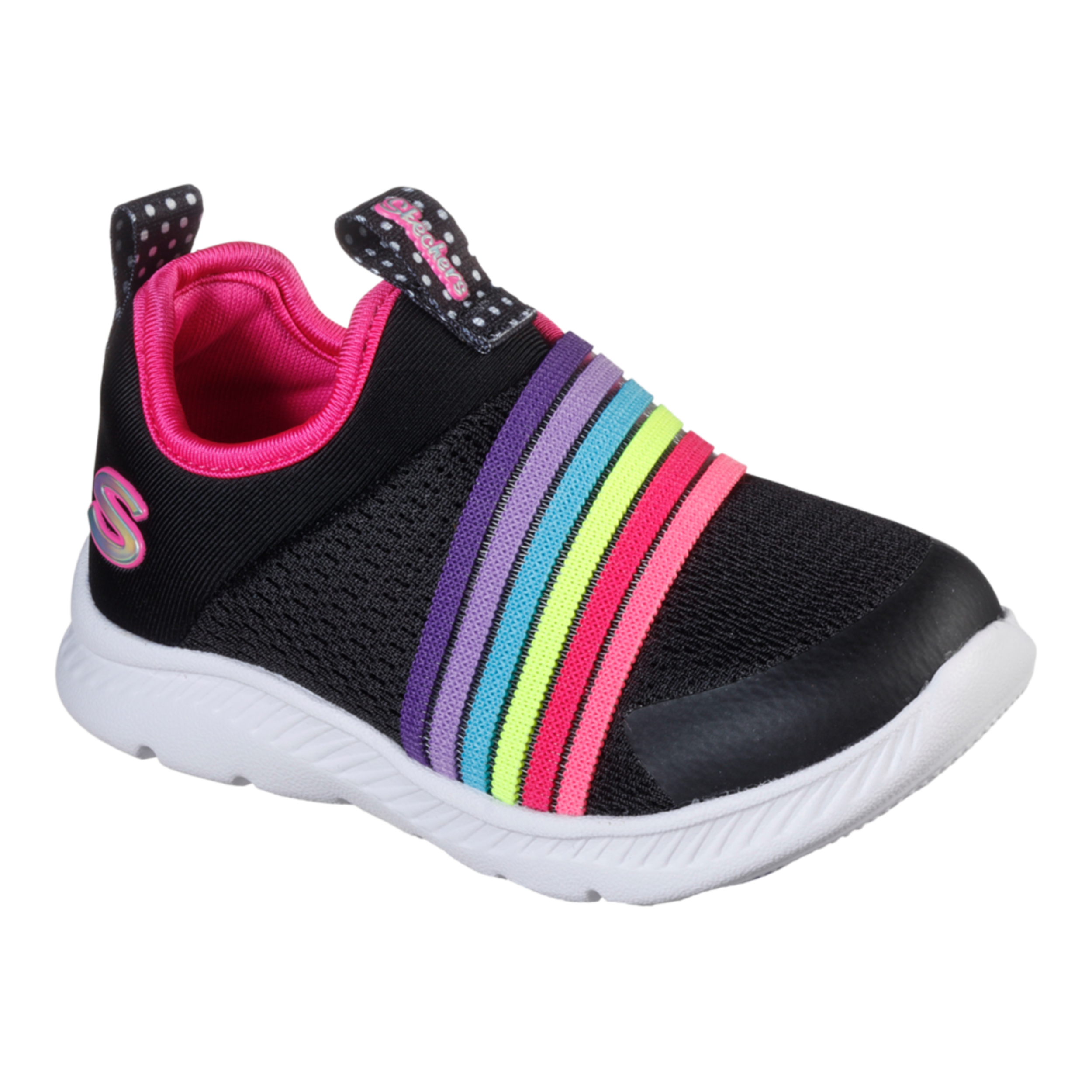 Little kickers will love the fun colors and comfort of the SKECHERS Comfy Flex 2.0 - Rainbow Frenzy shoe. Soft mesh and soft stretch fabric upper in a slip on sporty casual training sneaker with rainbow color diagonal stretch overlay panel, stitching and overlay accents.