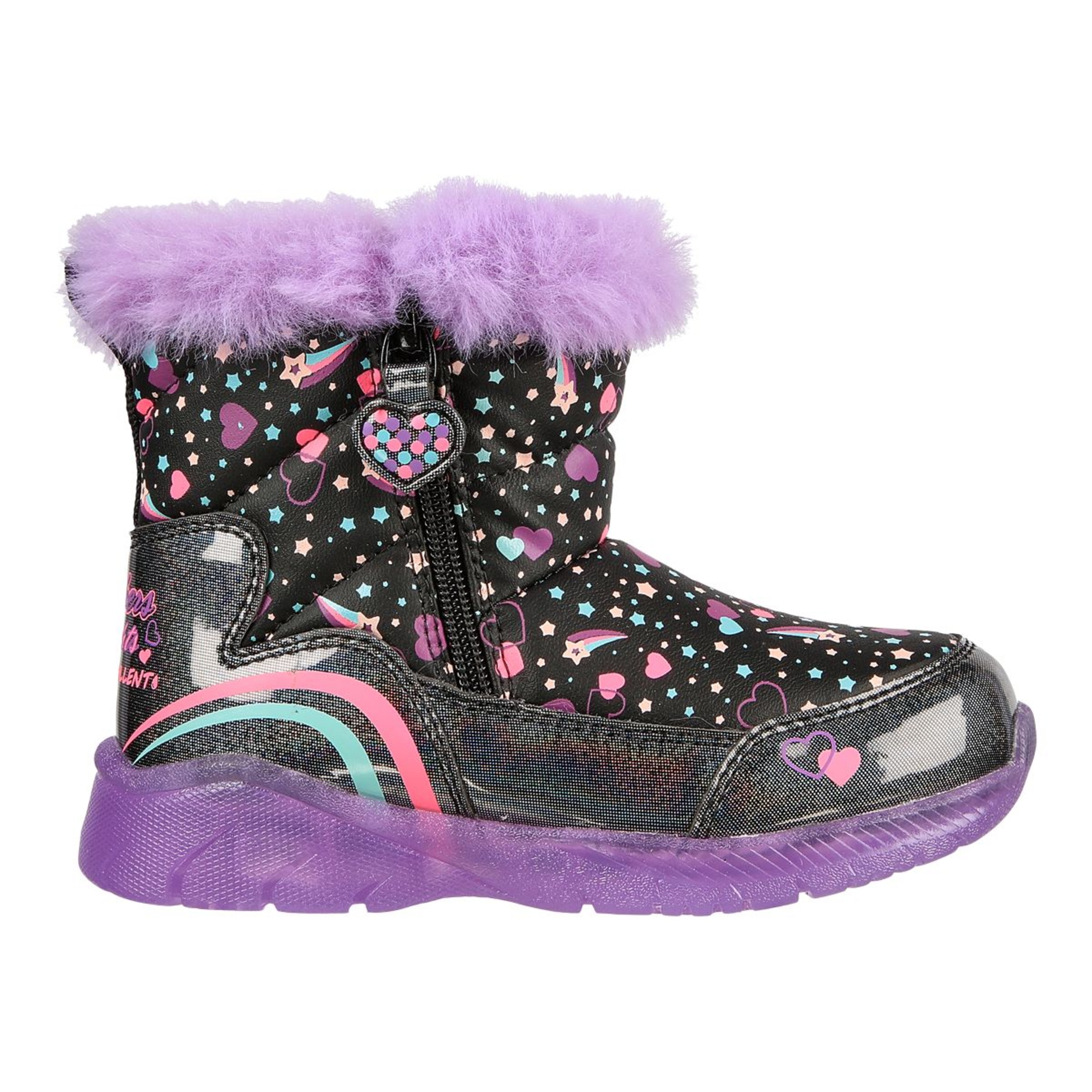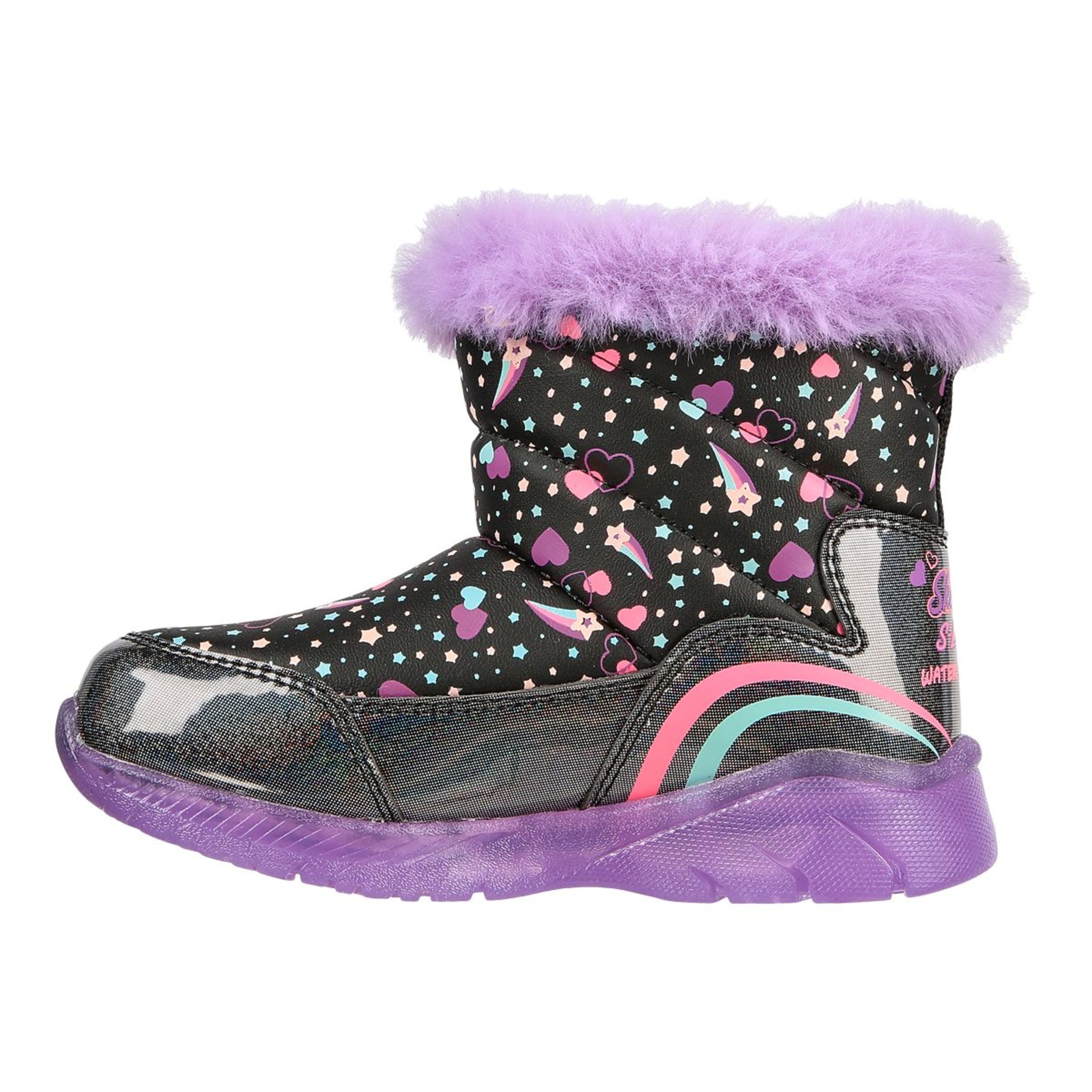 Style in cute cozy comfort with Skechers S Lights: Illumi-Brights. This sporty boot features a water repellent synthetic upper with all over heart and star print, cozy faux-fur lining and light-up midsole.