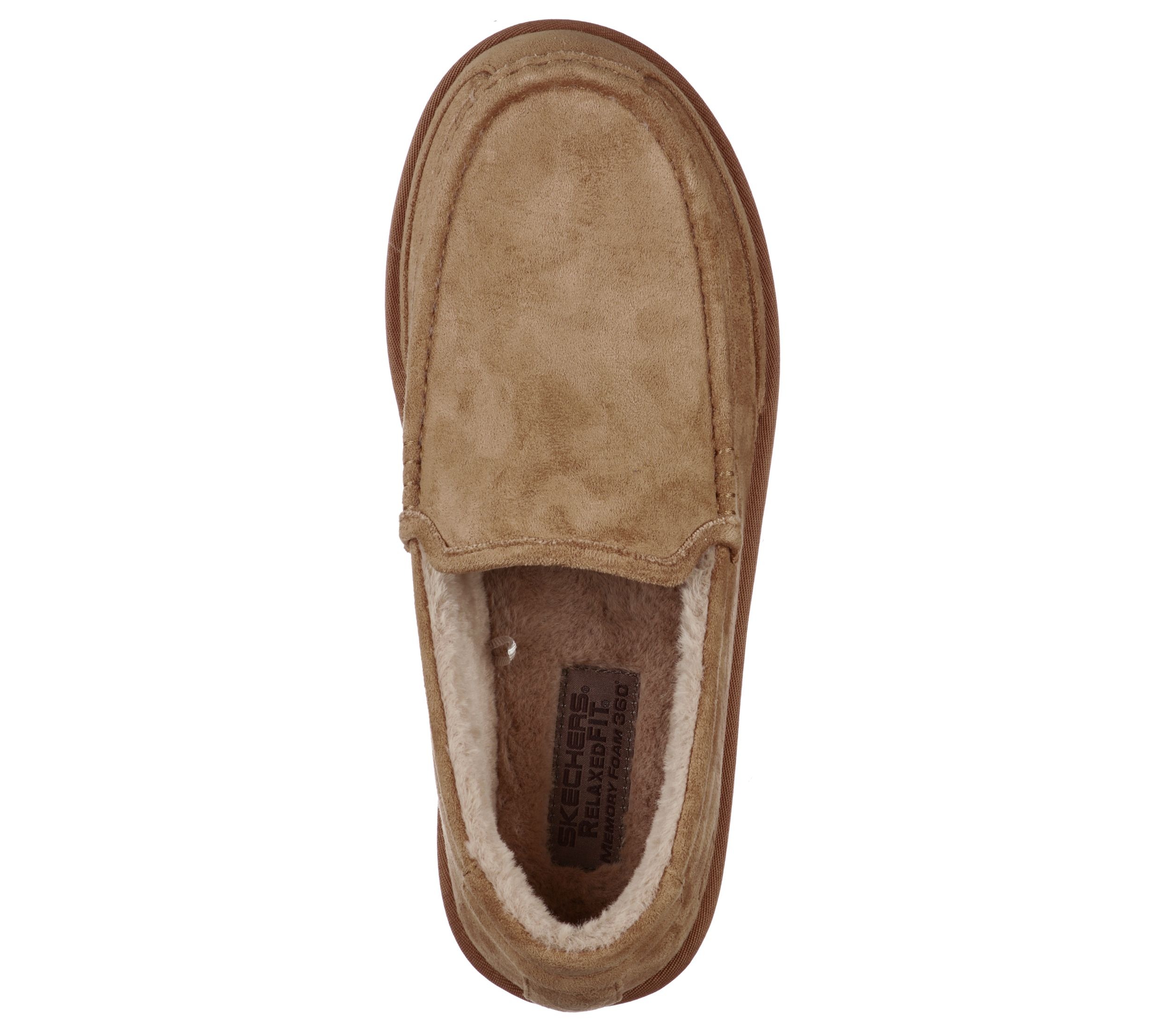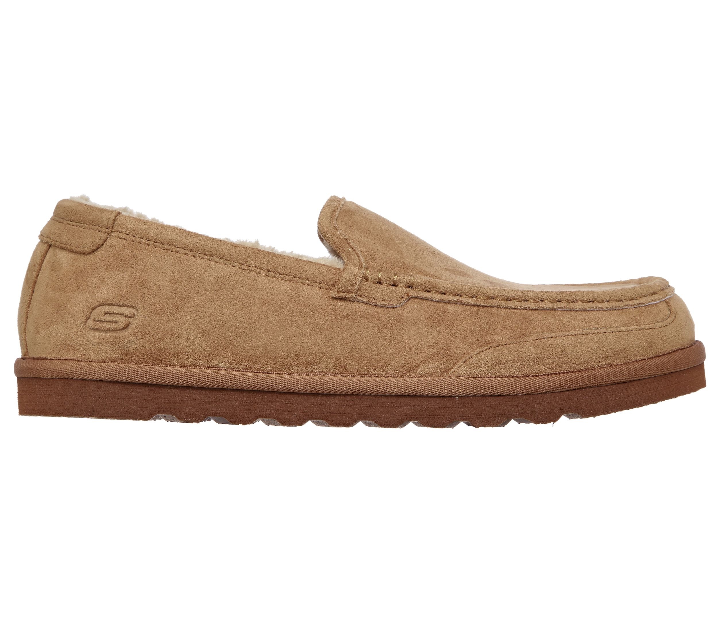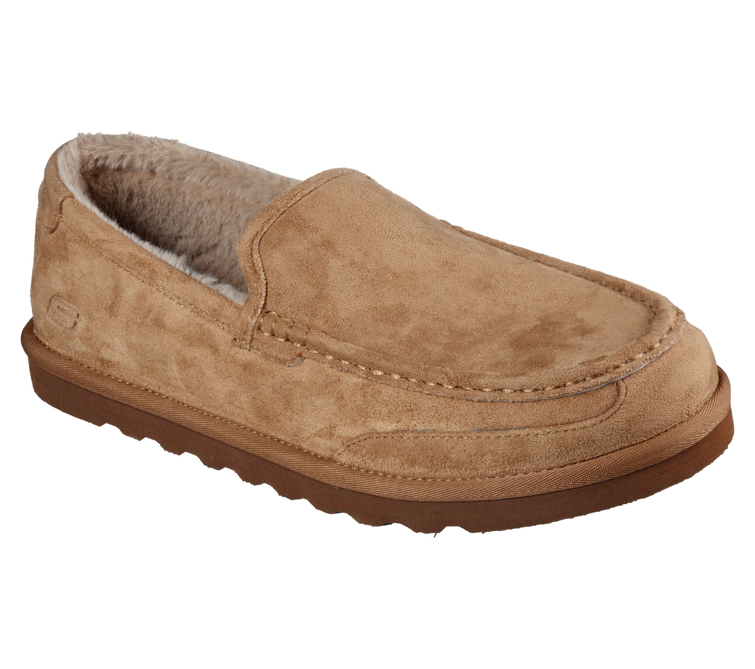 Reward your feet with snuggly warm comfort and handsome lounging style in the SKECHERS Relaxed Fit®: Renten - Oten shoe. Soft microfiber fabric upper in a slip on casual comfort slipper with stitching accents. Memory Foam footbed.