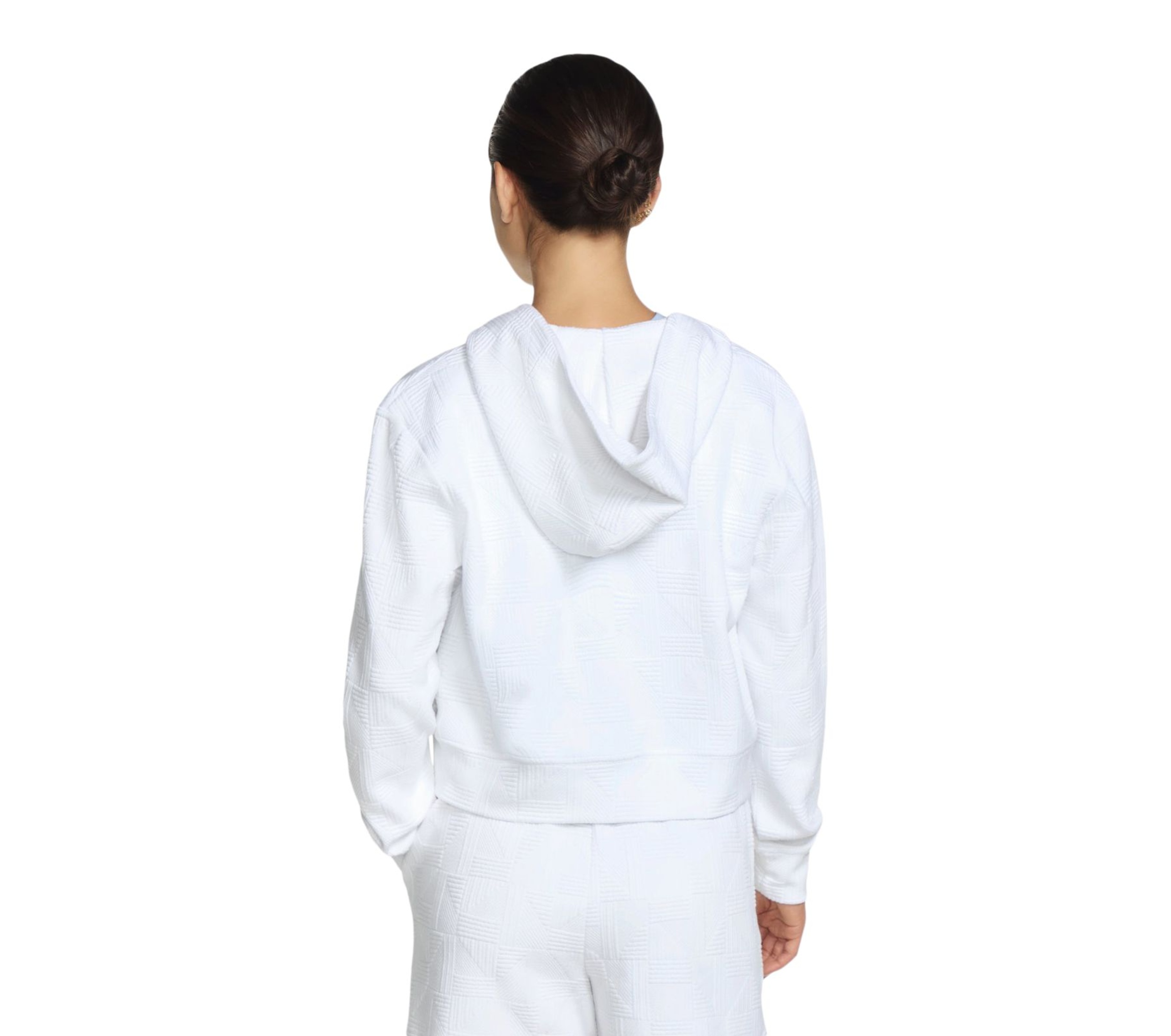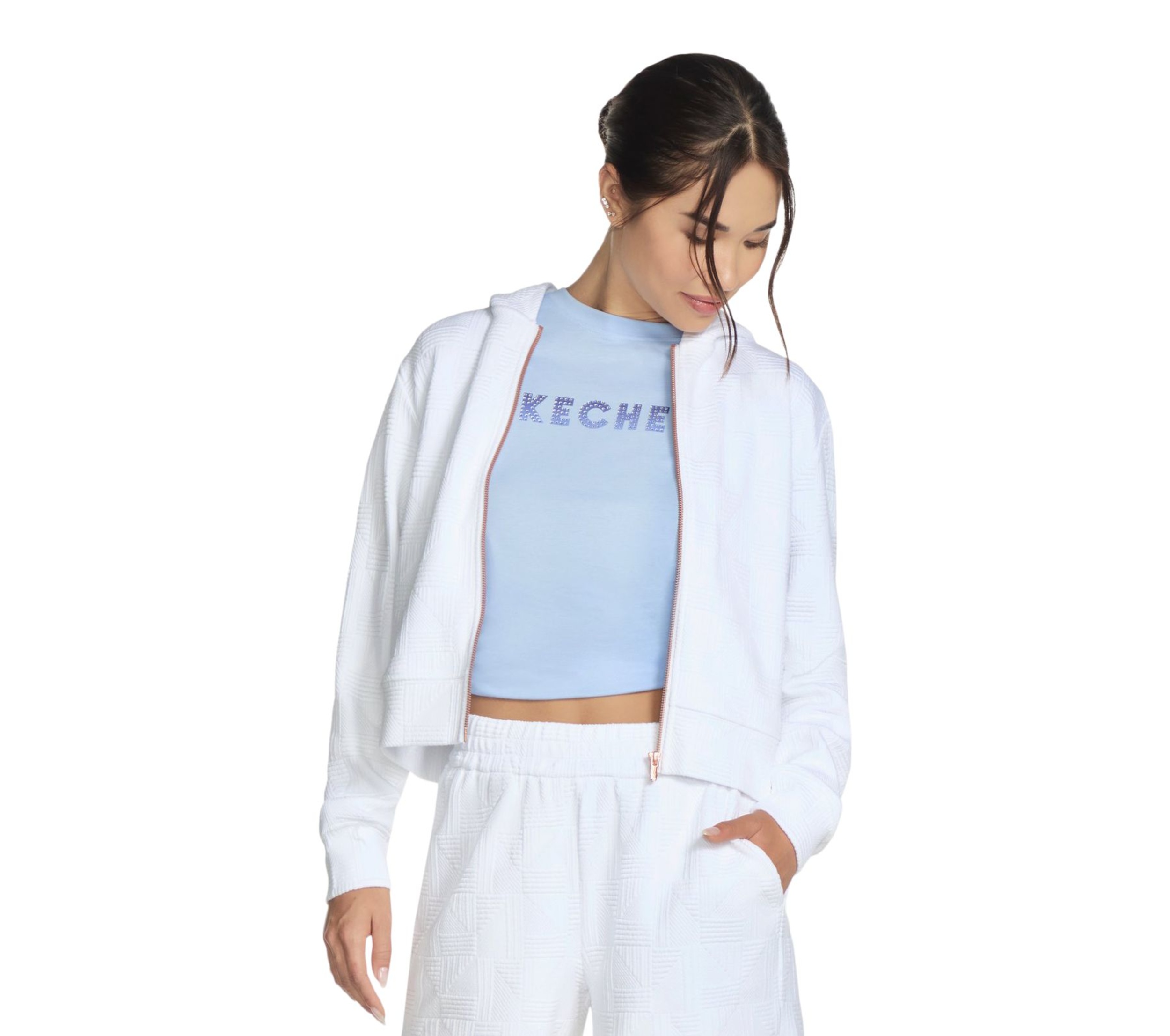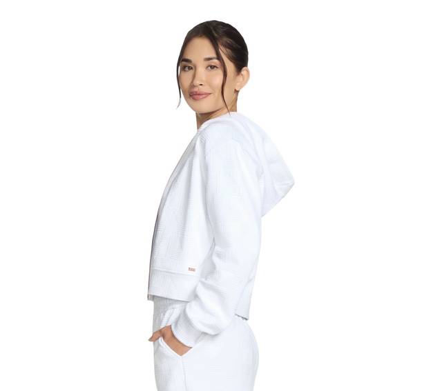 Keep it cool, casual and on trend wearing Skechers Women's Gowalk Diamond Full Zip Jacket. This short waist hooded jacket is made from Skechers’ Soft Knit Ottoman rib jersey with an allover diamond geo knit pattern, on seam hand pockets, and a self-lined hood. Part of a coordinating apparel collection.