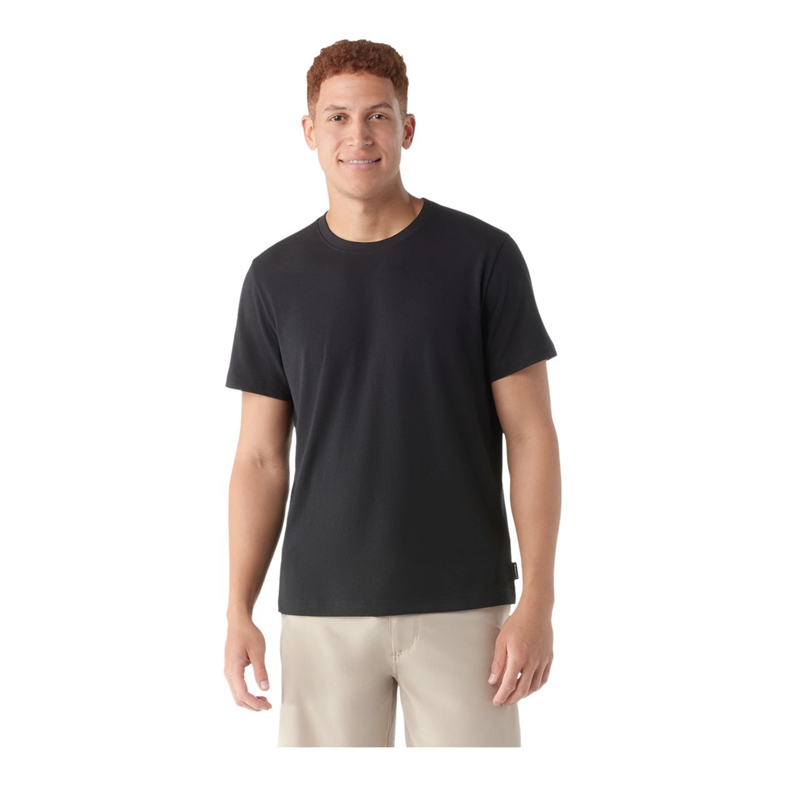 The Smartwool Men's Perfect Crew T Shirt blends merino wool and organic cotton for ultimate comfort. This standard-fit t shirt combines the moisture management and temperature regulation of merino wool with the softness of organic cotton for odour resistance. The Smartwool standard fit provides a slightly shorter length than their regular fit, allowing free movement. Set-in sleeves and a ribbed collar enhance wearability, making the Smartwool t shirt ideal for everyday comfort.