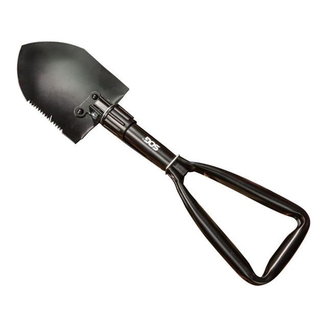 The SOG Entrenching Tool is a folding shovel for moving sand, dirt, or snow. Made from all steel, it features a tempered steel blade with teeth for cutting and digging. The triangular handle provides a secure grip. When folded, this compact SOG shovel takes up minimal space, ideal for outdoor adventures or emergency preparedness kits.