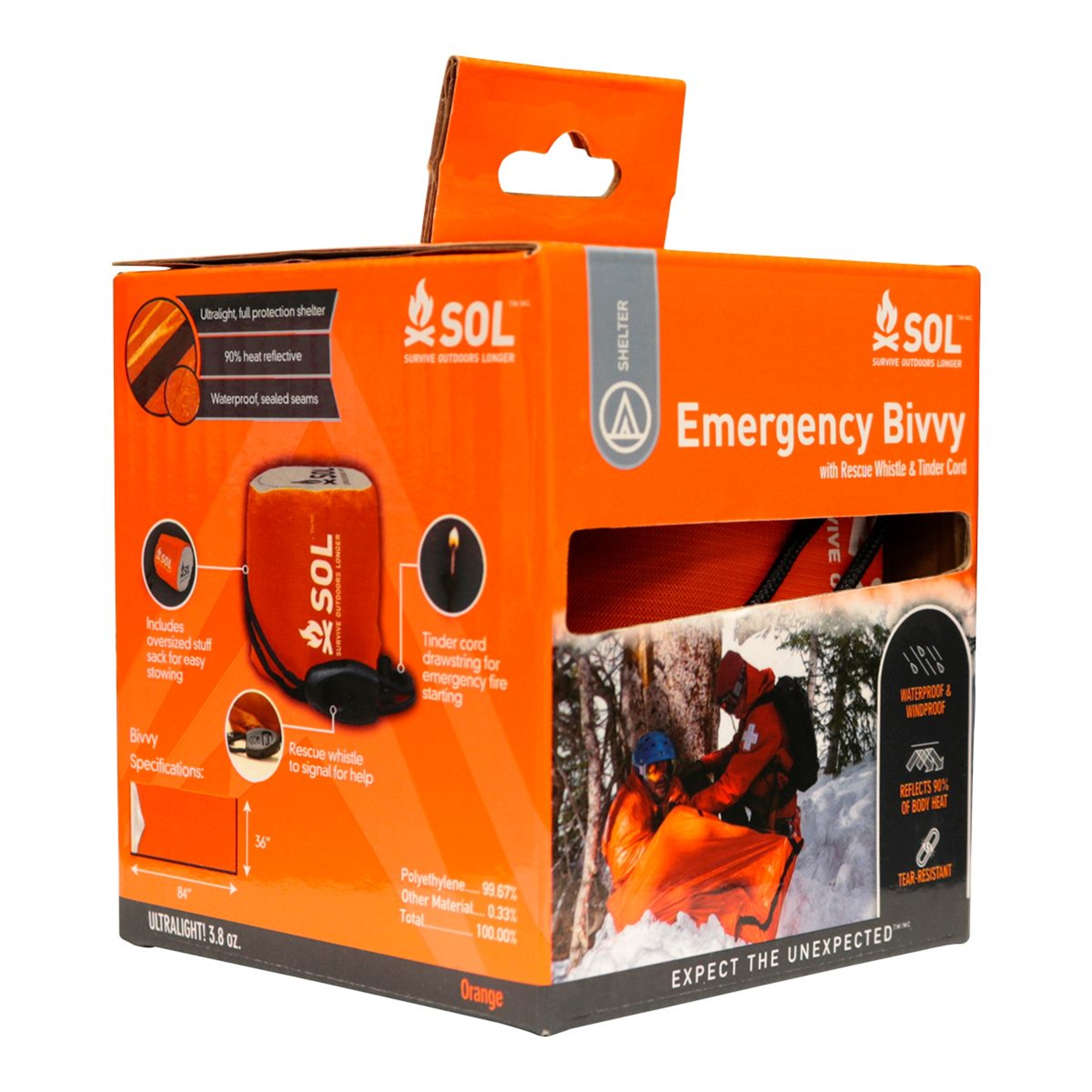 The SOL Emergency Bivvy with Rescue Whistle is a vital piece of survival gear, featuring a tinder paracord for fire starting and an emergency whistle for signaling. Made from quiet, tear-resistant material, it reflects 90% of body heat, ensuring warmth. Waterproof and windproof, this lightweight, reflective SOL bivvy is essential for any outdoor adventure.