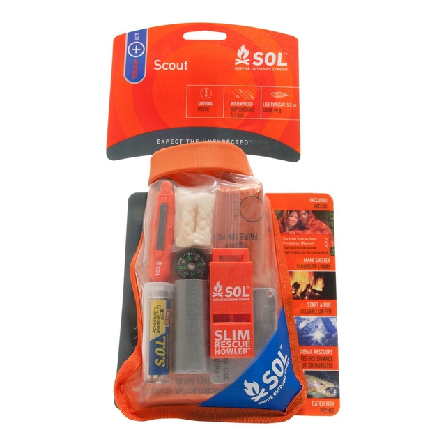 Be prepared for outdoor emergencies with the SOL Scout Waterproof Survival Kit. This compact kit includes a heat-reflective 2-person survival blanket, waterproof Fire Lite™ striker, Slim Rescue Howler™ whistle, Mini Rescue Flash™ signal mirror, liquid-filled button compass, duct tape, and a fishing/sewing kit. All these items address varying survival needs such as warmth, protection, fire lighting, rescue signalling, navigation, and repairs on the go. You can protect all these supplies with the help of a professional-grade RF-welded waterproof dry bag. Plus, the survival instructions are printed right on the blanket for precaution and added safety.