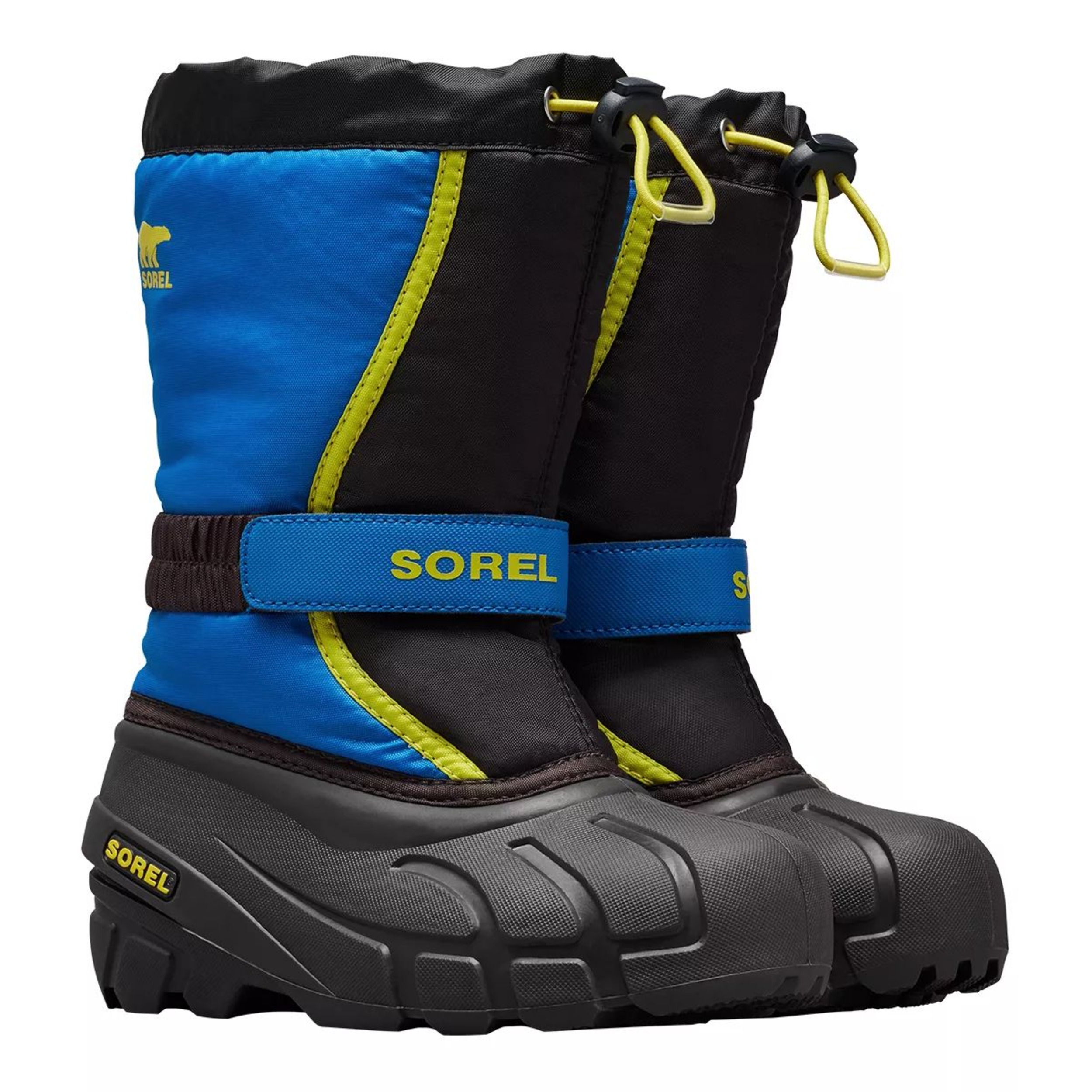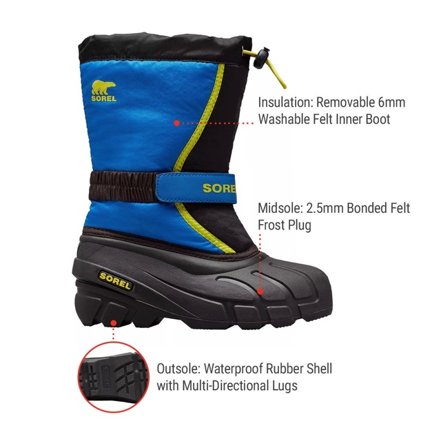 The Sorel Kids' Flurry Winter Boots feature extreme insulation, an elastic strap for easy on-and-off, and wind-resistant material. The flurry will keep them protected all winter long. Upper: Durable water and wind resistant PU backed synthetic textile upper. The boots also feature a built-in gaiter with a barrel lock closure system and an adjustable elastic instep strap.