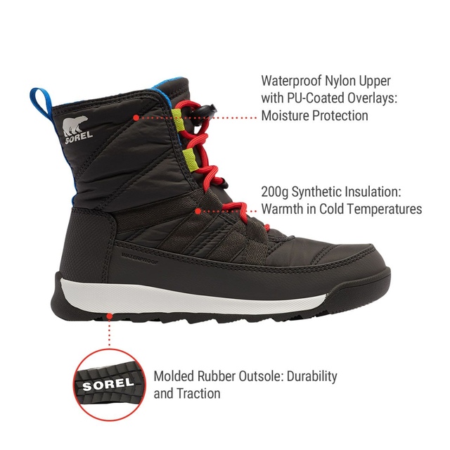 Sorel Kids' Whitney II Waterproof Winter Boots provide warmth and comfort for cold-weather fun. Featuring a waterproof nylon upper, lace-up closure and 200 g synthetic insulation, these boots keep feet dry and cozy. A removable PU-like EVA footbed ensures comfort and support for all-day wear. Keep your kids warm and dry wearing these non-slip insulated winter boots.