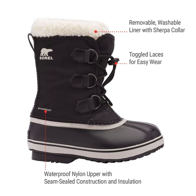 The Sorel Kids' Yoot Pac Winter Boots are the perfect choice for winter adventures. Waterproof and warm, these boots feature seam-sealed construction and a cozy Sherpa cuff to keep little feet snug while they play. The vulcanized rubber shell and extra-grip sole ensure reliable traction on even the slickest surfaces.