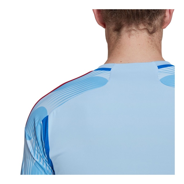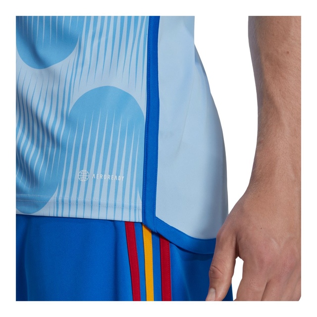 Ready to take on the world. The undulating graphic on this adidas jersey takes its dynamic inspiration from the art deco-style logo that welcomed football's finest to Spain in 1982. At the centre of the chest, woven versions of the 3 Bar Logo and Spain's updated badge take pride of place. Created to keep fans comfortable, the shirt is made with moisture-wicking AEROREADY.