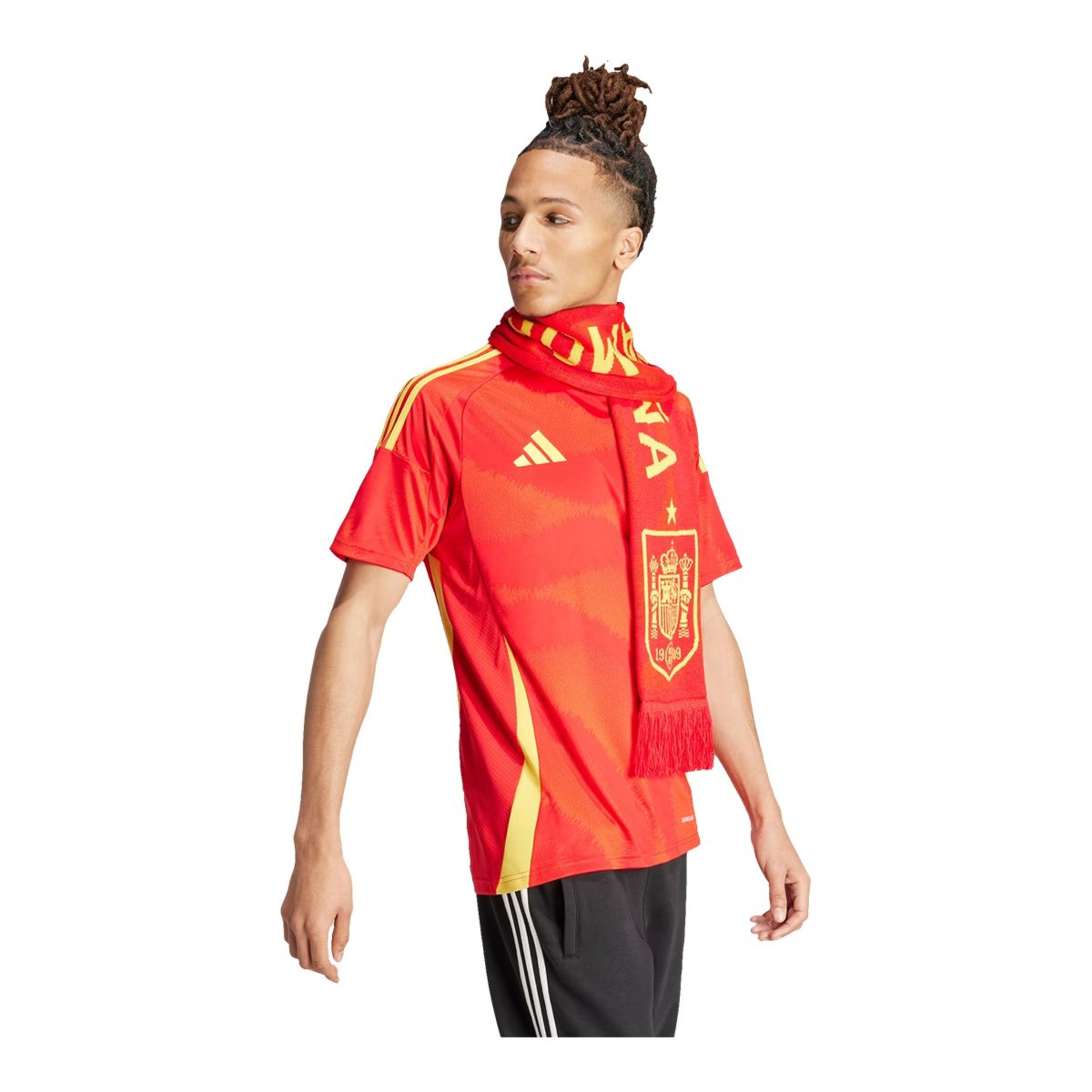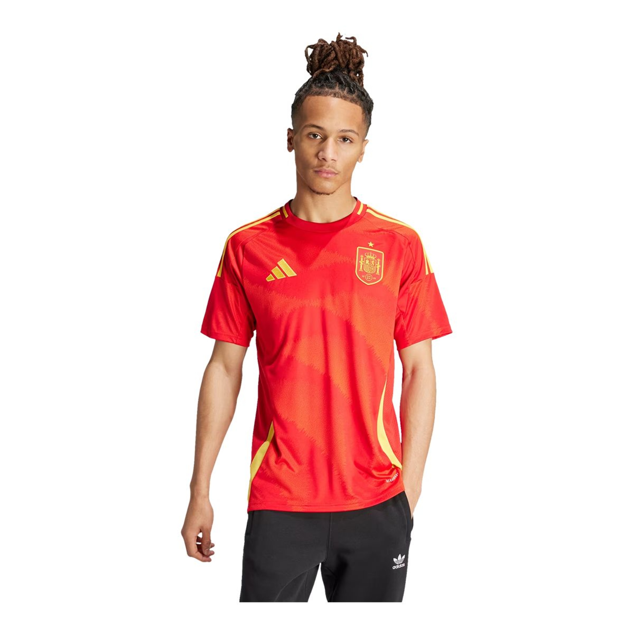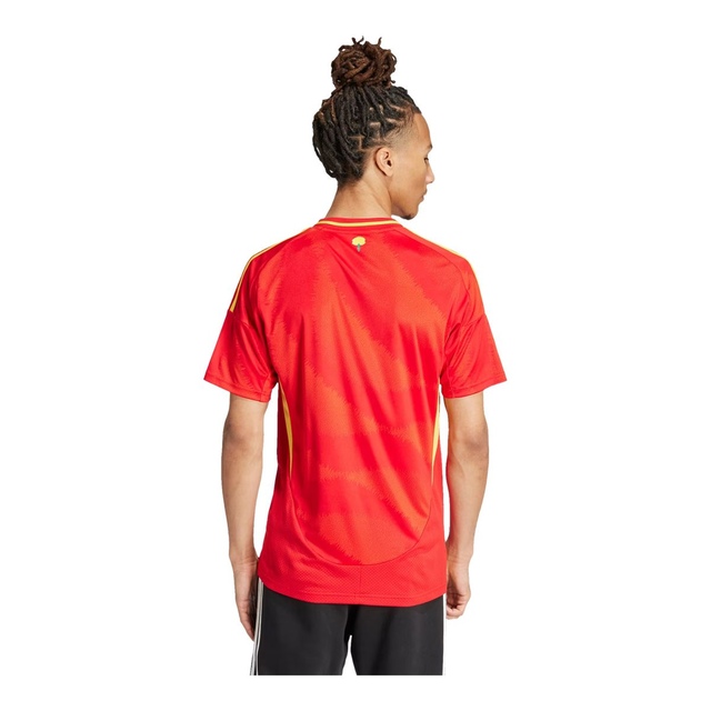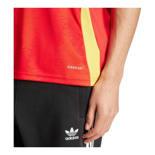 Their soccer roots run deep. Inspired by the beauty of Spain's national flower and the powerful, graceful movement of flamenco dancing, this adidas Spain home jersey displays an eye-catching tonal graphic. Built for supporter comfort and pride, it teams moisture-managing AEROREADY with a woven badge and carnation sign-off. This product is made with 100% recycled materials. By reusing materials that have already been created, adidas helps to reduce waste and their reliance on finite resources and reduce the footprint of the products they make.