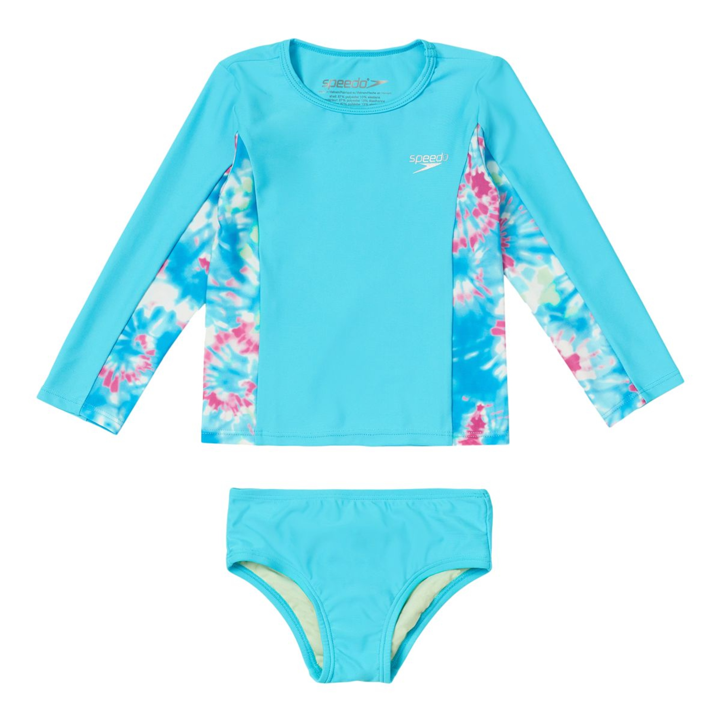 The Speedo Kids' Long Sleeve Rashguard Set provides sun protection with its long-sleeve rashguard top and bikini bottom. Made from quick-drying, pill-resistant fabric, this rashgaurd set provides durability and comfort.