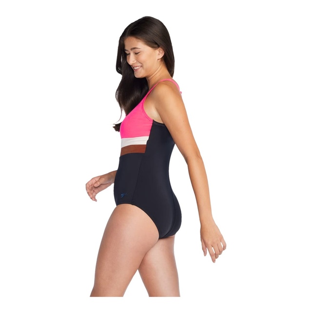 The Speedo Women's Bonded Colorblock One Piece Swimwear is a fashionable and functional choice for your next swim. Crafted with sewn-in soft cups for coverage and support, this one-piece swimsuit features a moderate leg cut for a flattering fit and adjustable straps to customize your comfort. Made with REPREVE® certified recycled content, it's an eco-friendly option that doesn't compromise on style or performance with its colorblock design, UPF 50+ sun protection blocking up to 98% of harmful rays, and chlorine and pilling resistant qualities for long-lasting wear.