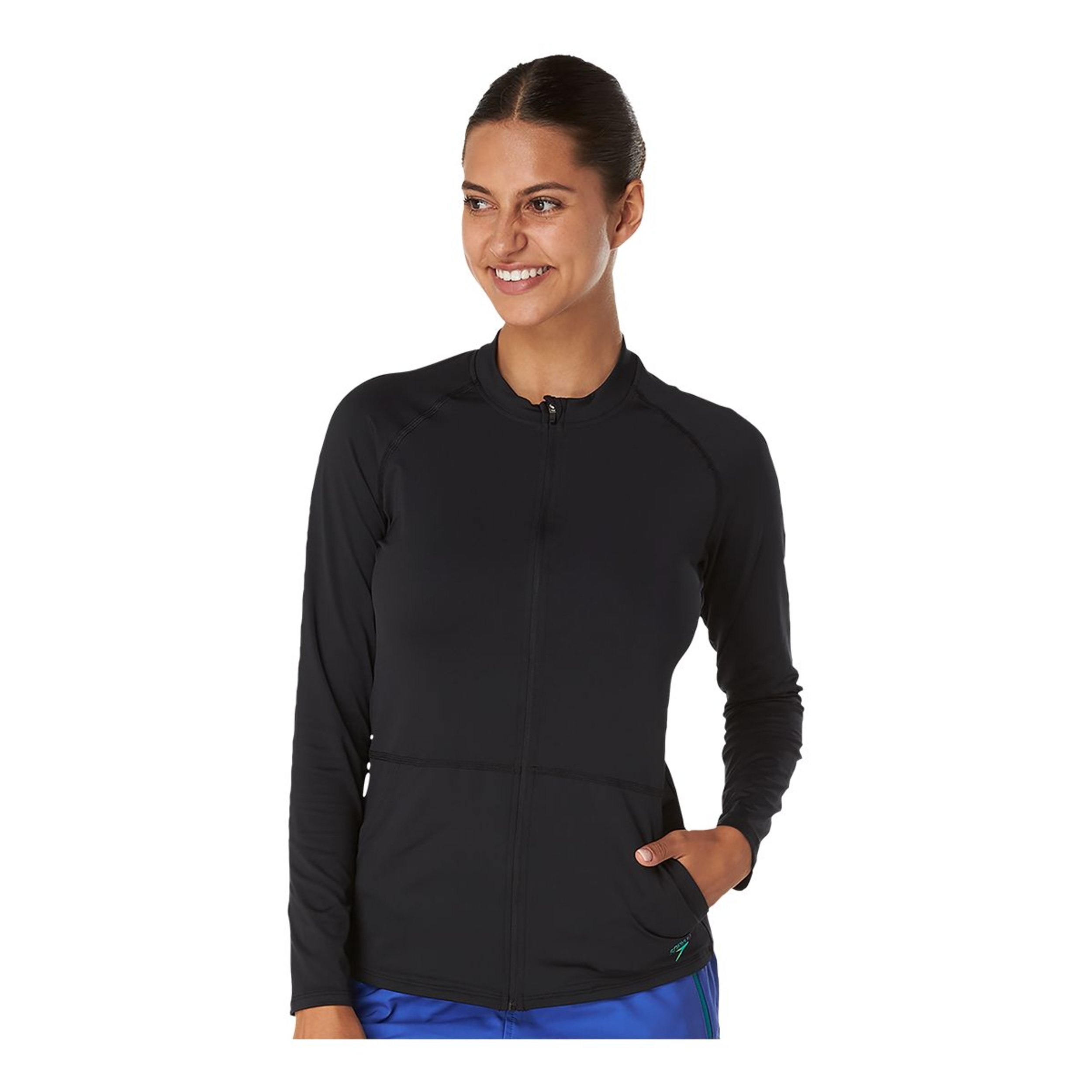 This full zip long sleeve rash guard from Speedo is perfect for water activities that require full sun protection. With a UPF rating of 50+ to block harmful UV rays, the full front zipper allows for easy on and off while the long sleeves and high neck provide full coverage. Made from recycled polyester fabric that dries quickly, it will keep you comfortable while swimming, surfing or paddleboarding on sunny days. The soft, stretchy material moves with you so you can focus on enjoying the water, not worrying about sunburn or tan lines.