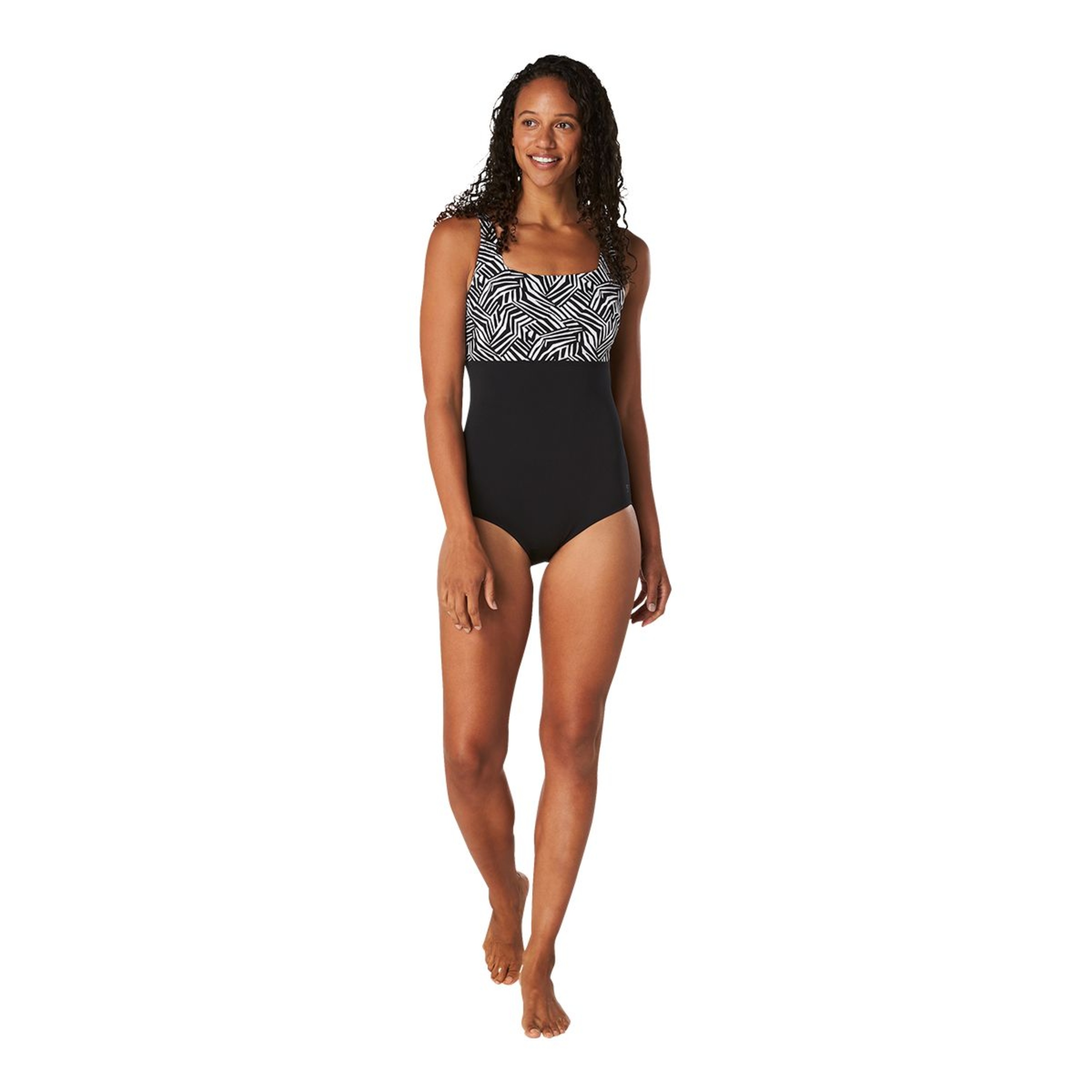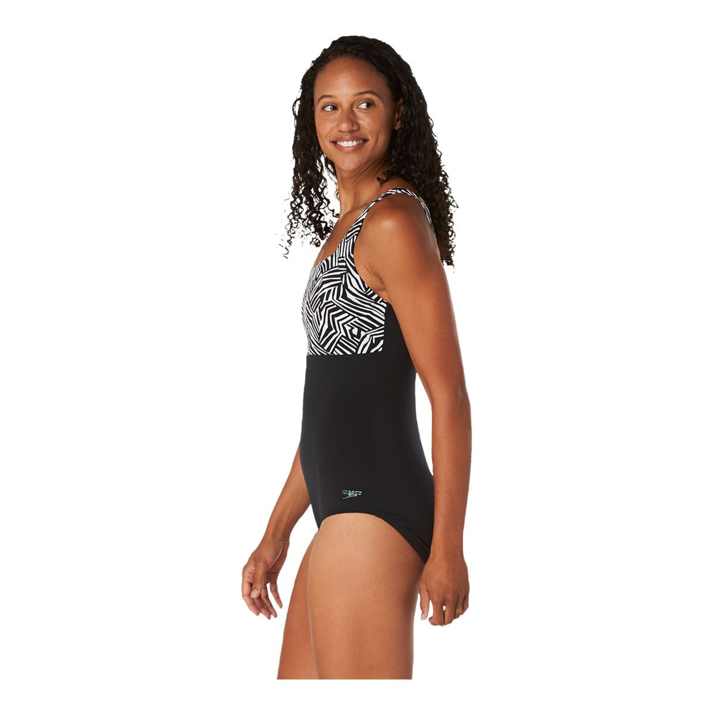 This Speedo Women's One Piece Swimsuit features print block design and a square neck for an updated look on a swimwear classic. Sewn-in soft cups and a moderate leg height offer enhanced comfort. Made with recycled polyester content, this Speedo swimsuit has UPF 50+ protection, adjustable straps and chlorine-resistant fabric.