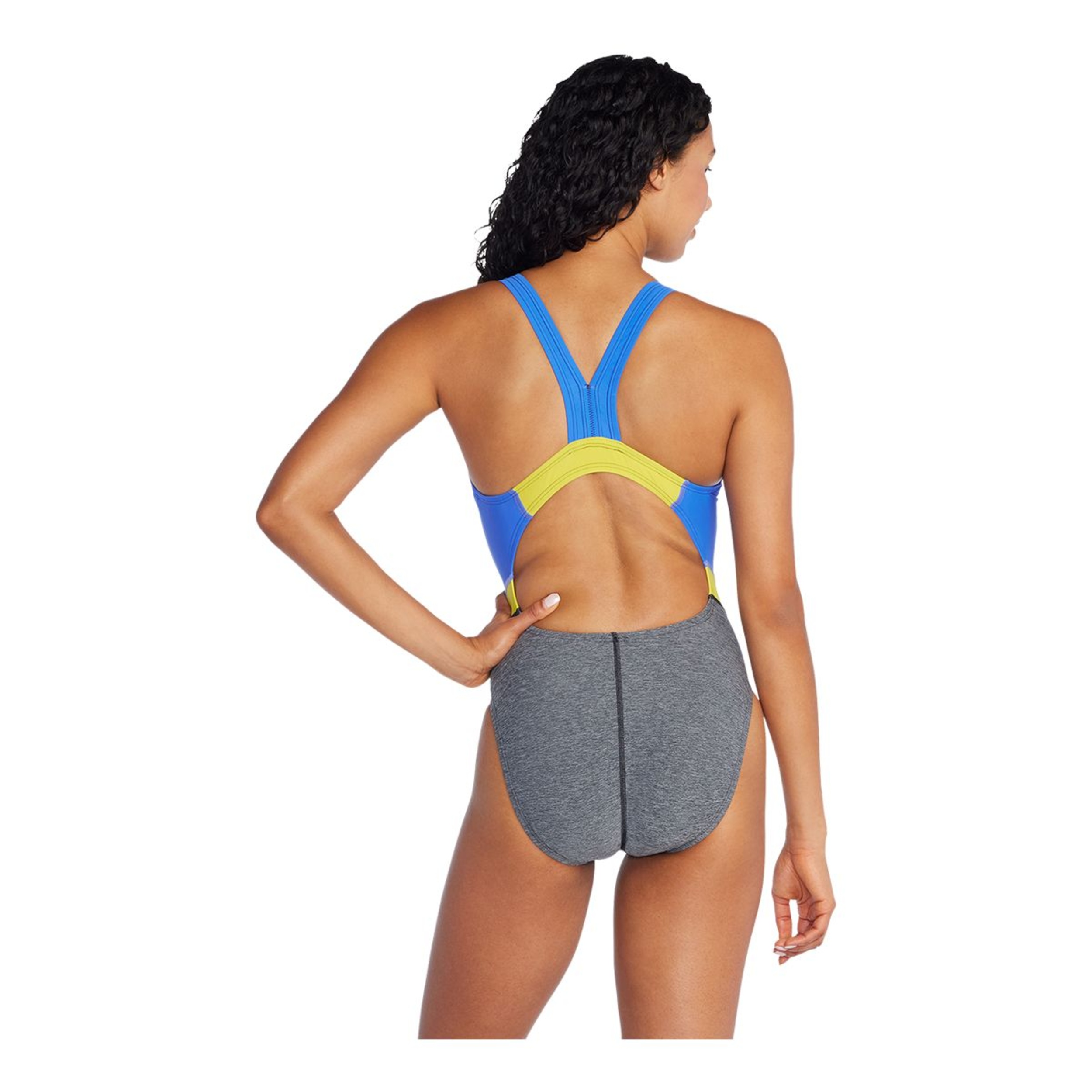 The Speedo Women's Quantum Fusion Slice Heather One Piece features Block the Burn UPF 50+ technology, which blocks 98% of UV rays. The racing leg design and Hydro Bra with removable cups enhance performance during water activities. This fully lined swimsuit includes pilling-resistant fabric for extended durability.