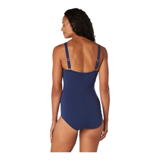 Tank style suit with front shirring helps accentuate the waist