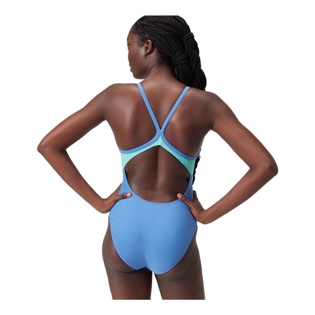 The Speedo Women's SIS Colourblock Racer One Piece Swimwear combines XLANCE® technology with Repreve® Polyester yarn for durable performance. The thin strap racerback design with a removable cup-shelf bra enhances movement during swim sessions. This eco-conscious swimsuit features yarn made from recycled plastic bottles and includes a textured liner for quick drying after use.