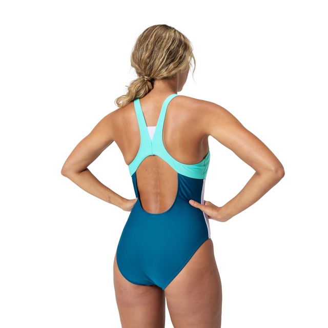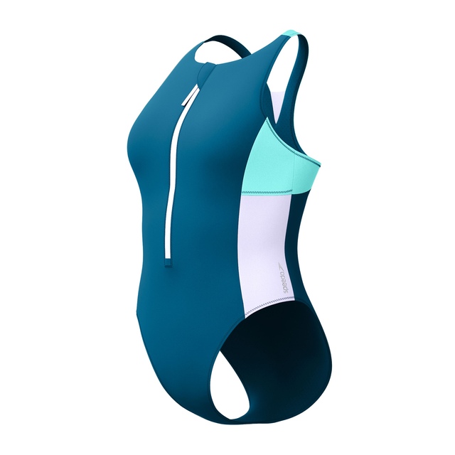The Speedo Women's Zip Color Block One Piece Swimsuit combines stylish design with performance technology. This streamlined one-piece features a high neckline, zip-up front and racerback straps in a trendy color block pattern.