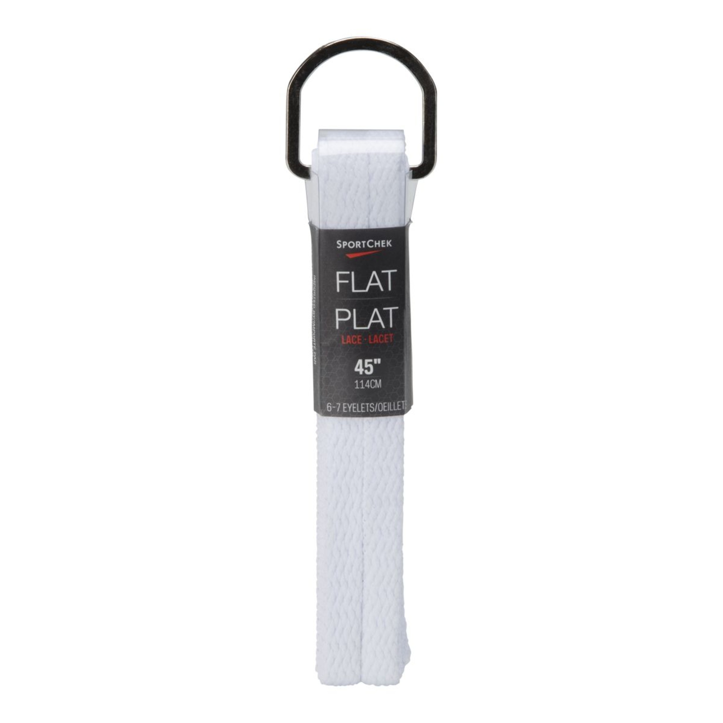 Enhance your footwear with Sport Chek 45 Inch D-Ring Flat Shoe Laces. Measuring 45 inches in length, these durable, black laces are designed to fit shoes with D-ring eyelets, providing a secure and stylish fit for any activity. These Sport Chek brand laces are ideal for both athletic and casual shoes.