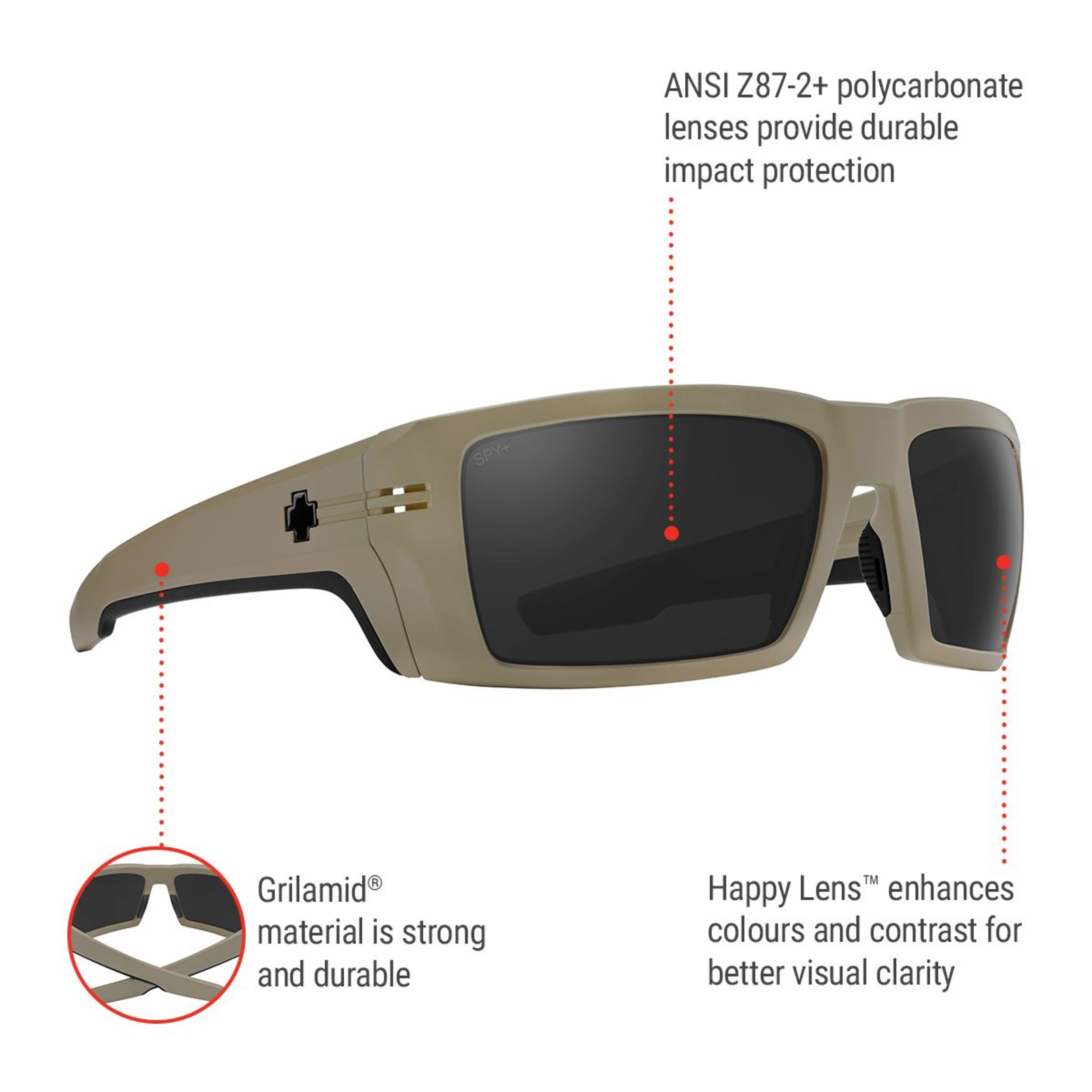 Spy Unisex Rebar ANSI Sunglasses provide superior protection and durability. With a rugged design and Accurate Radius Curvature (ARC) polycarbonate lenses available with polarization, these sunglasses offer comfort during intense activities. ANSI Z87-2+ certified, these sunglasses have rubber nose pads and temple tips to ensure a secure fit.