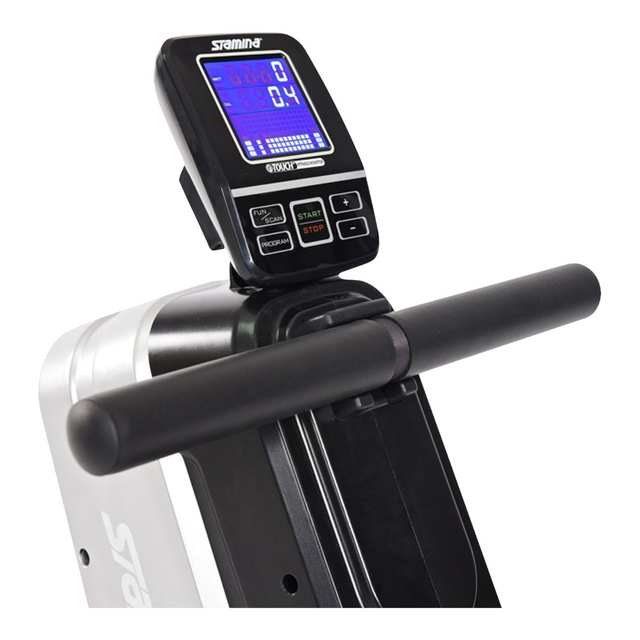Experience commercial-quality workouts at home with the Stamina Magnetic Rowing Machine 1130. This versatile machine features 16 levels of smooth magnetic resistance, allowing you to achieve challenging workouts while enjoying your favorite TV shows or spending time with family. Designed for optimal performance, it boasts an aluminum rowing beam and ball-bearing rollers for a seamless rowing stroke. The pivoting footplates and adjustable straps ensure a secure and comfortable experience. Track your progress on the backlit workout monitor, which displays total strokes, strokes per minute, workout time, distance, and calories burned. With 9 pre-set programs and the ability to create 4 personalized programs, reaching your fitness goals has never been easier. The included heart rate monitor wirelessly syncs with the fitness monitor, helping you stay within your target heart rate zone for improved cardiovascular performance and fat burning. Enjoy enhanced comfort with the premium molded seat and foam rowing handle, and conveniently store the machine in a corner or closet by standing it on its end. Plus, you'll receive free access to müüv, the smart audio coaching app that provides personalized workouts tailored to your equipment and preferences. Download the müüv app from the Apple App Store or Google Play store for an all-in-one fitness experience.