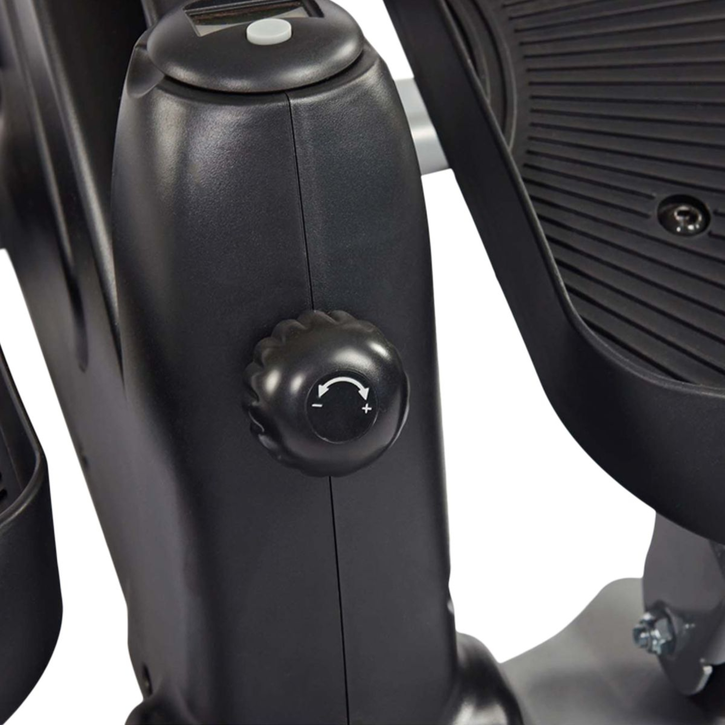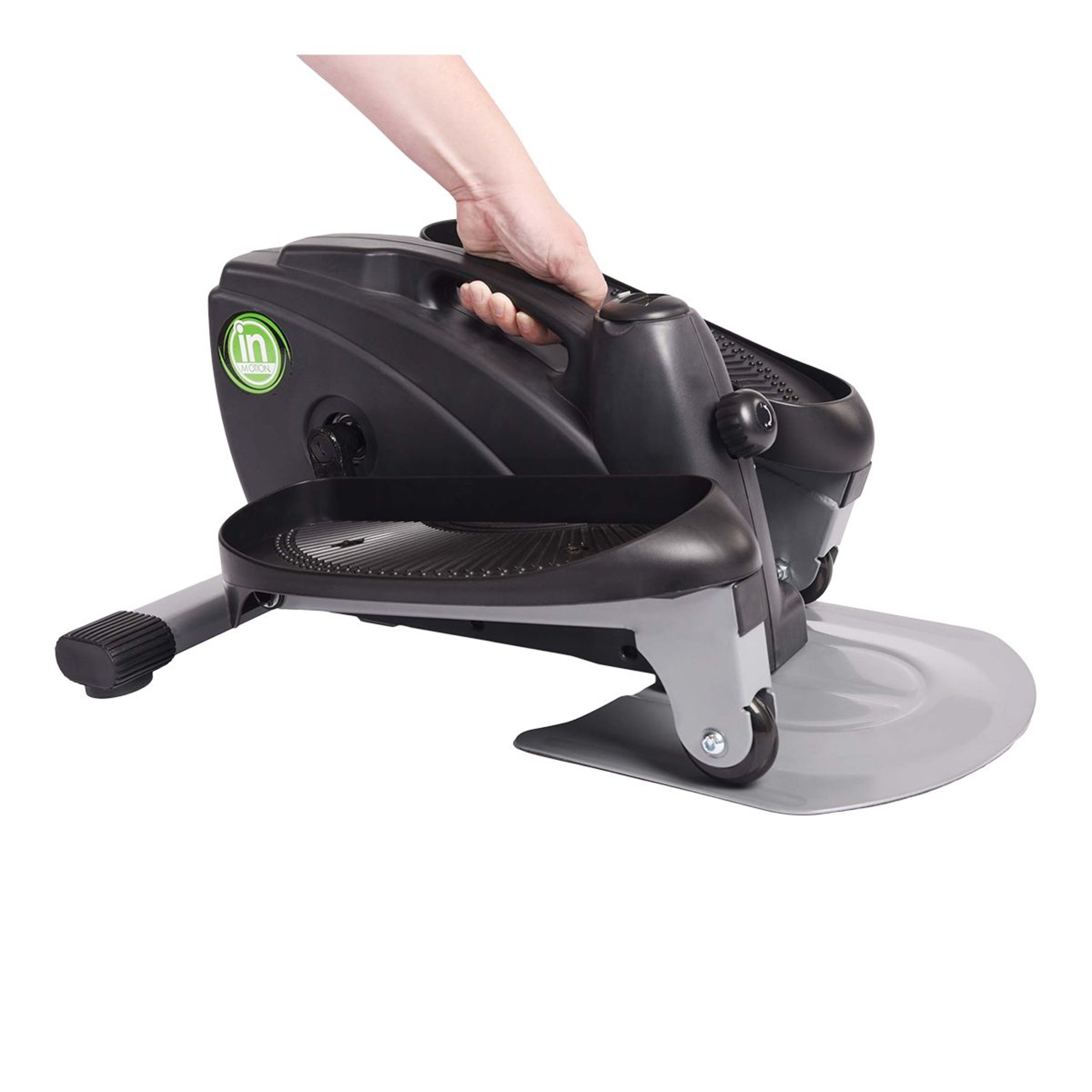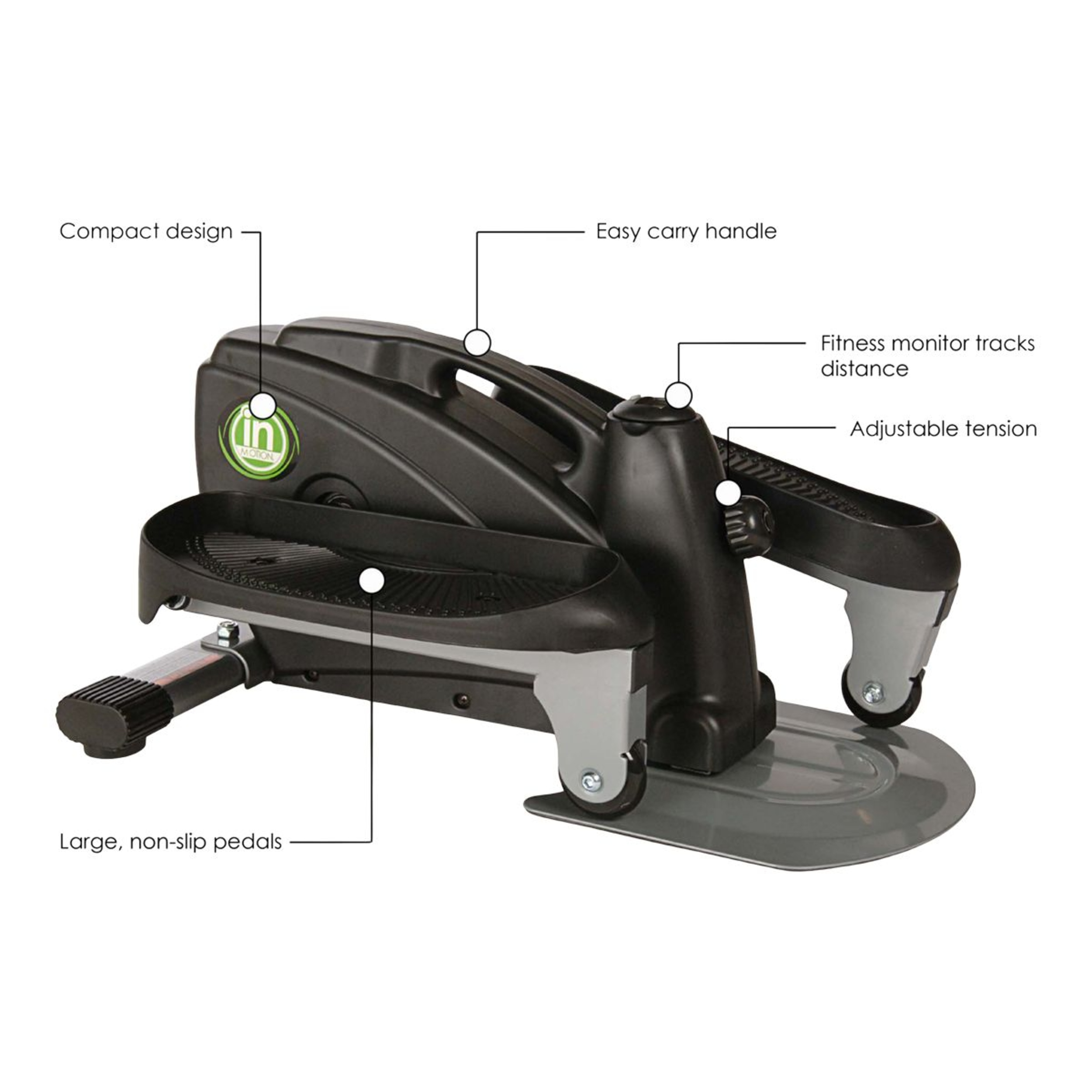 The elliptical motion of the Stamina InMotion Compact Strider provides a low impact, calorie burning, cardiovascular workout without taking up a lot of space. Whether you are pressed for time, space or both, the InMotion Compact Strider is your fitness solution. Since you can use it sitting or standing, it's the perfect fit for the home or office to tone your calves, thighs and glutes while getting your heart pumping. Place your feet on the large, non-slip pedals and feel the heavy duty wheels roll on the steel base. The adjustable tension allows you to control the intensity of your workout, while the monitor keeps track of your distance, workout time, calories burned and stride count. After your workout, simply pick up the Strider by the easy carry handle and move it out of the way.