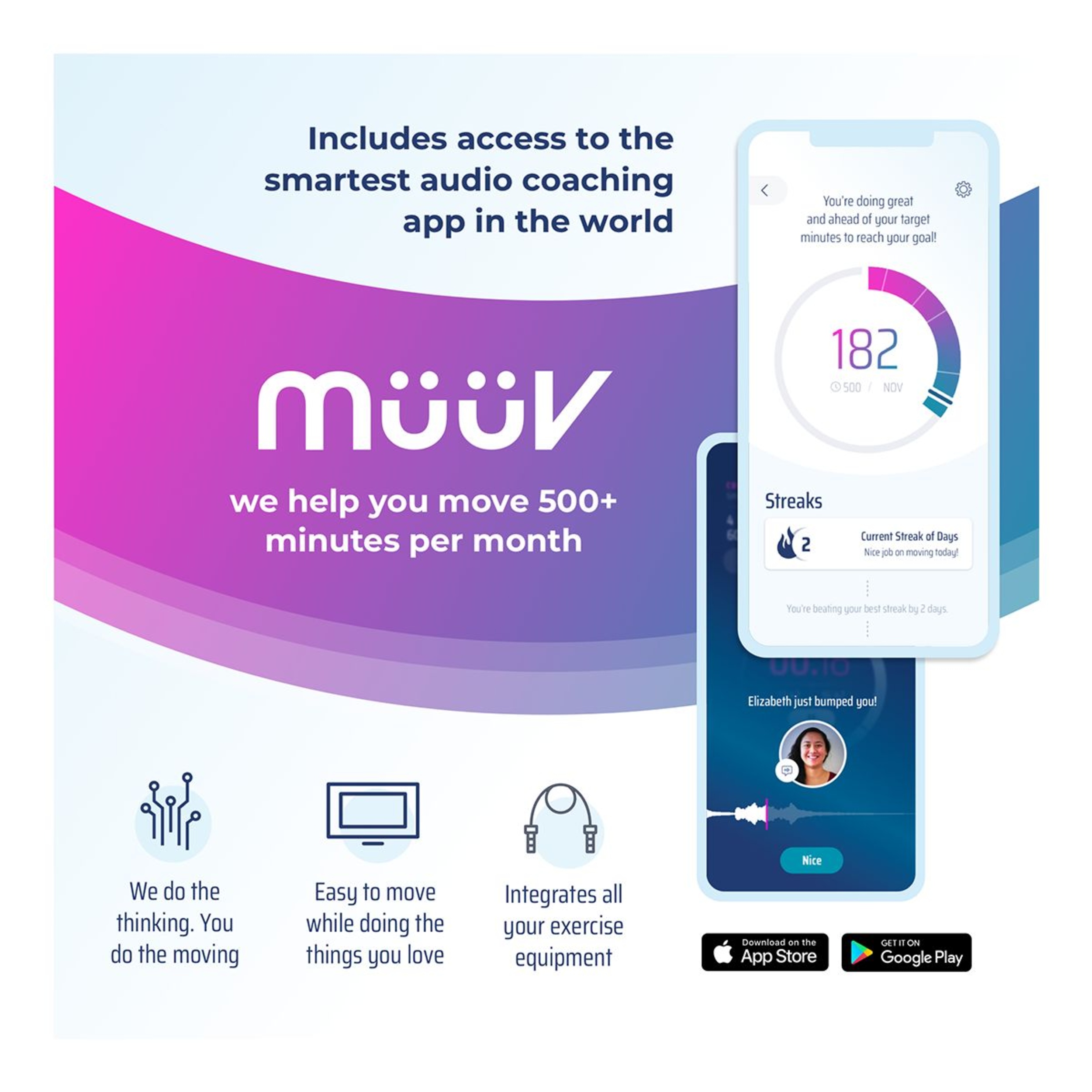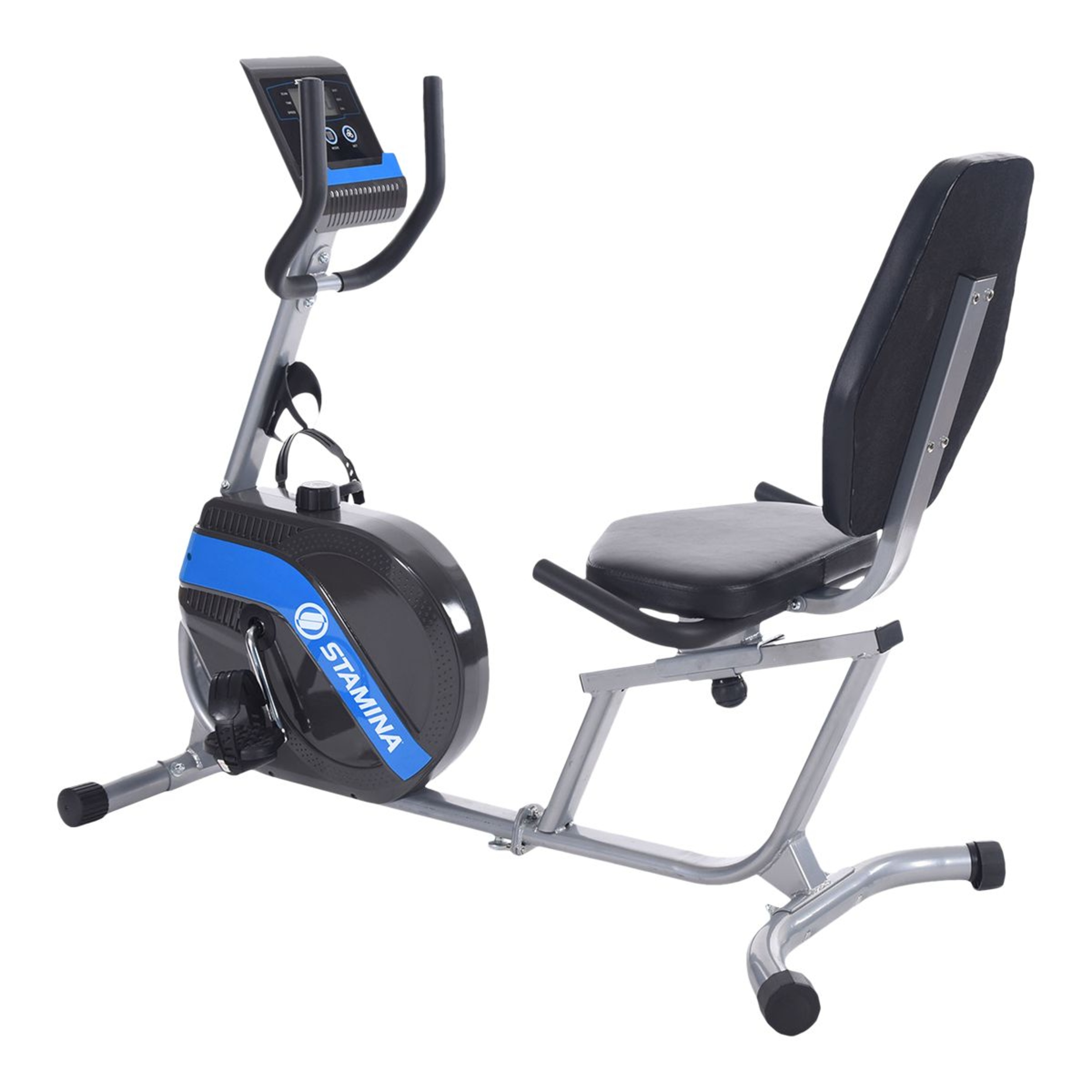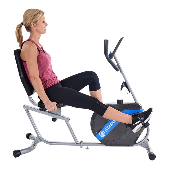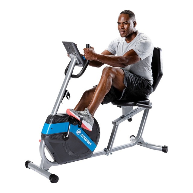 Introducing the Stamina Recumbent Exercise Bike 345, an affordable and comfortable solution for your home gym. It offers 8 levels of quiet and smooth magnetic resistance for a customizable workout. The recumbent design provides an ergonomic sitting position with an extra-large cushioned seat and backrest for comfort and stability. The bike features a step-through design, padded handles, and adjustable seat height. The LCD display monitor tracks your progress, and the built-in device tray allows you to watch shows or stay connected. This product includes free access to müüv, a smart audio coaching app that helps you achieve a healthy lifestyle. After your workout, easily store the bike using the built-in wheels.