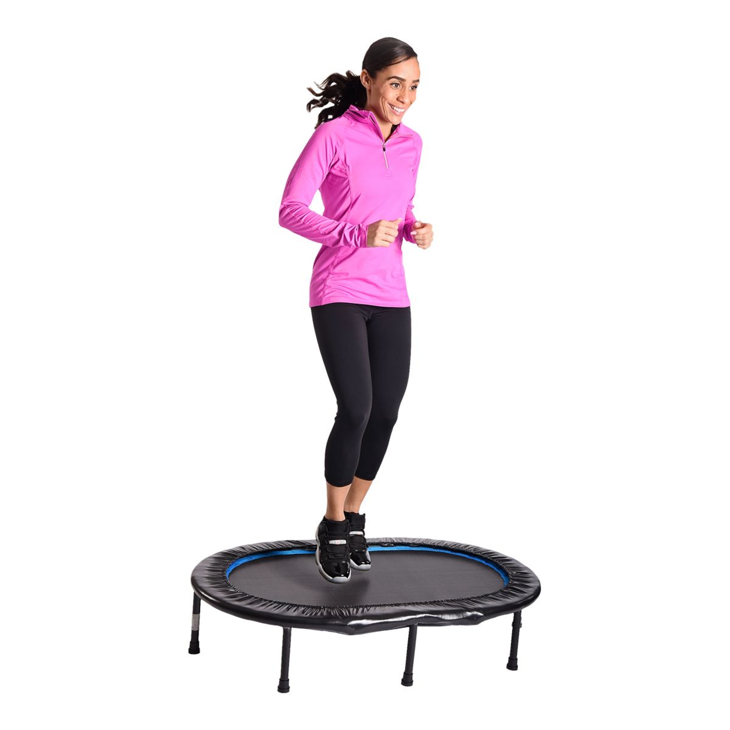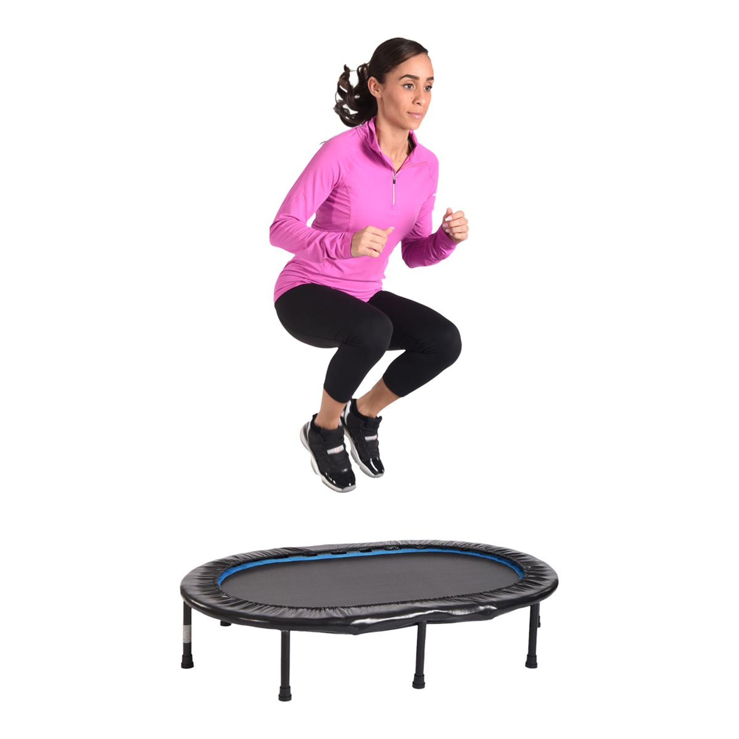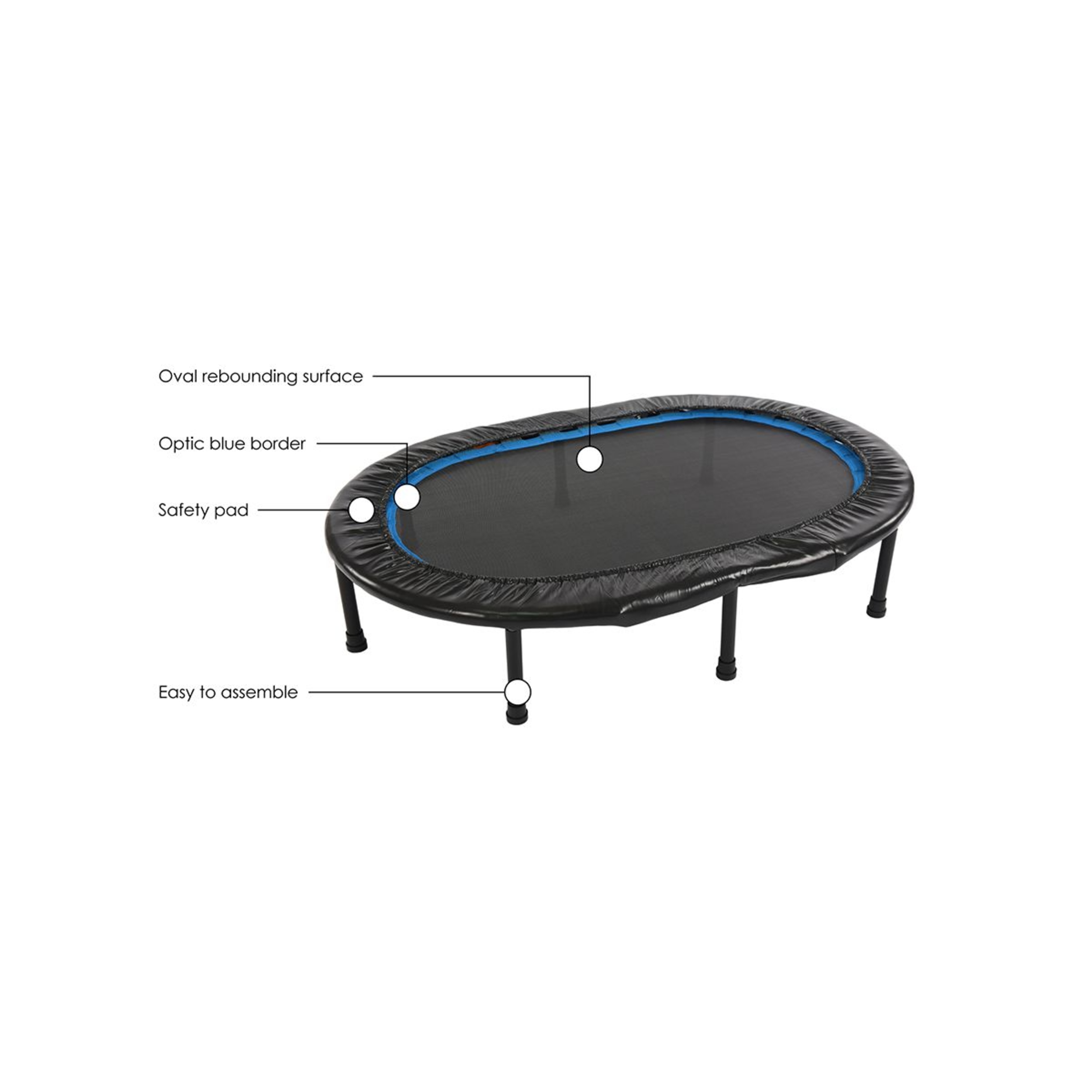 Online Only - GET THE MOST OUT OF REBOUNDING. Rebounding is one of the best ways to get a calorie-burning, endurance-building workout without impact. With the Oval Fitness Trampoline, it's now more fun and effective than ever. The oval rebounding surface provides more stability than normal trampolines. Plus, the wider surface allows for more varied workouts. The safety pad will also keep you off the elastic bands. And with the trampoline's optic blue border, you'll always be jumping in the best spot. SUPPORTED BY MÜÜV This product includes free access to müüv, the smart audio coaching app. müüv helps you move 500+ minutes per month with the right mix of cardio, strength, and flexibility for a healthy and sustainable lifestyle. You'll get smart audio coaching that is personalized to you, progresses for you, and is fun to do. The all-in-one app comes with a follow-along assembly video, personalized workouts tailored to the equipment you own, and an ad-free music listening experience from iHeartRadio. Download the müüv app on the Apple App Store or the Google Play store. COMPACT AND CONVENIENT. Unlike a treadmill or large elliptical machine, the Stamina Oval Fitness Trampoline only takes up a 45" by 33" area on the ground. You'll be able to use it and move it as much as you would like. But just because it's small doesn't mean it's not sturdy. The trampoline can support up to 250 pounds. And when you have a way to exercise at home, it's hard to find excuses. With a healthy diet and regular use, you'll begin to see results. .